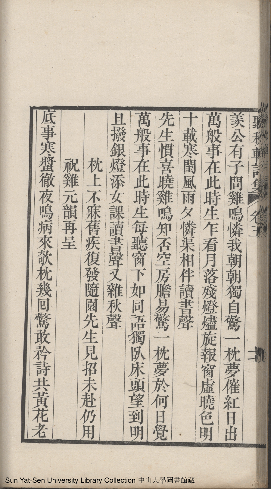 | (PRINT FRIENDLY VERSION) 聽秋軒詩集:六卷(清駱綺蘭撰)。清嘉慶金陵龔氏刻本 ![]() Page : 卷五18a | click for larger image | 聽秋軒詩集:六卷(清駱綺蘭撰)。清嘉慶金陵龔氏刻本![]() Page : 卷五17b | click for larger image | Back |
