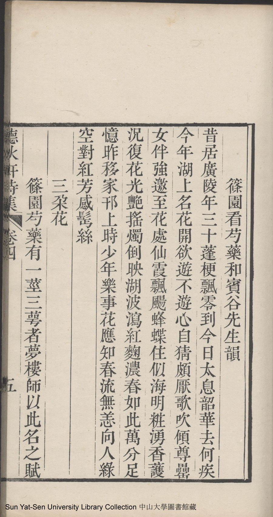 | (PRINT FRIENDLY VERSION) 聽秋軒詩集:六卷(清駱綺蘭撰)。清嘉慶金陵龔氏刻本 ![]() Page : 卷四5a | click for larger image | Back |