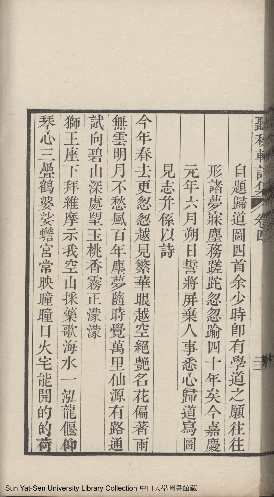 Poem [Zi ti Gui dao tu si shou yu shao shi ji you xue dao zhi yuan wang wang xing zhu meng mei chen wu cuo tuo hu hu yu si shi nian yi jin Jiaqing yuan nian liu yue shuo ri shi jiang bing qi ren shi xi xin gui dao xie tu jian zhi bing xi yi shi(si shou)]