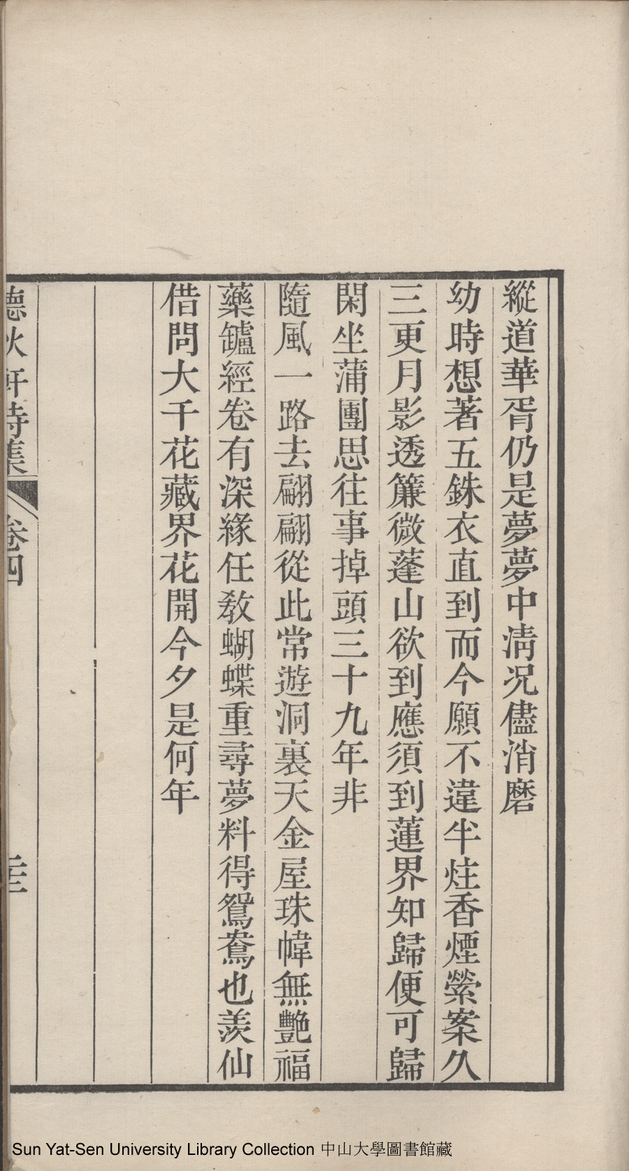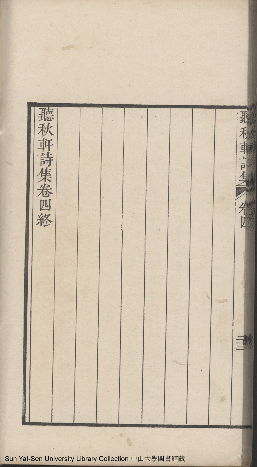 | (PRINT FRIENDLY VERSION) 聽秋軒詩集:六卷(清駱綺蘭撰)。清嘉慶金陵龔氏刻本 ![]() Page : 卷四22b | click for larger image | 聽秋軒詩集:六卷(清駱綺蘭撰)。清嘉慶金陵龔氏刻本![]() Page : 卷四22a | click for larger image | 聽秋軒詩集:六卷(清駱綺蘭撰)。清嘉慶金陵龔氏刻本![]() Page : 卷四21b | click for larger image | Back |