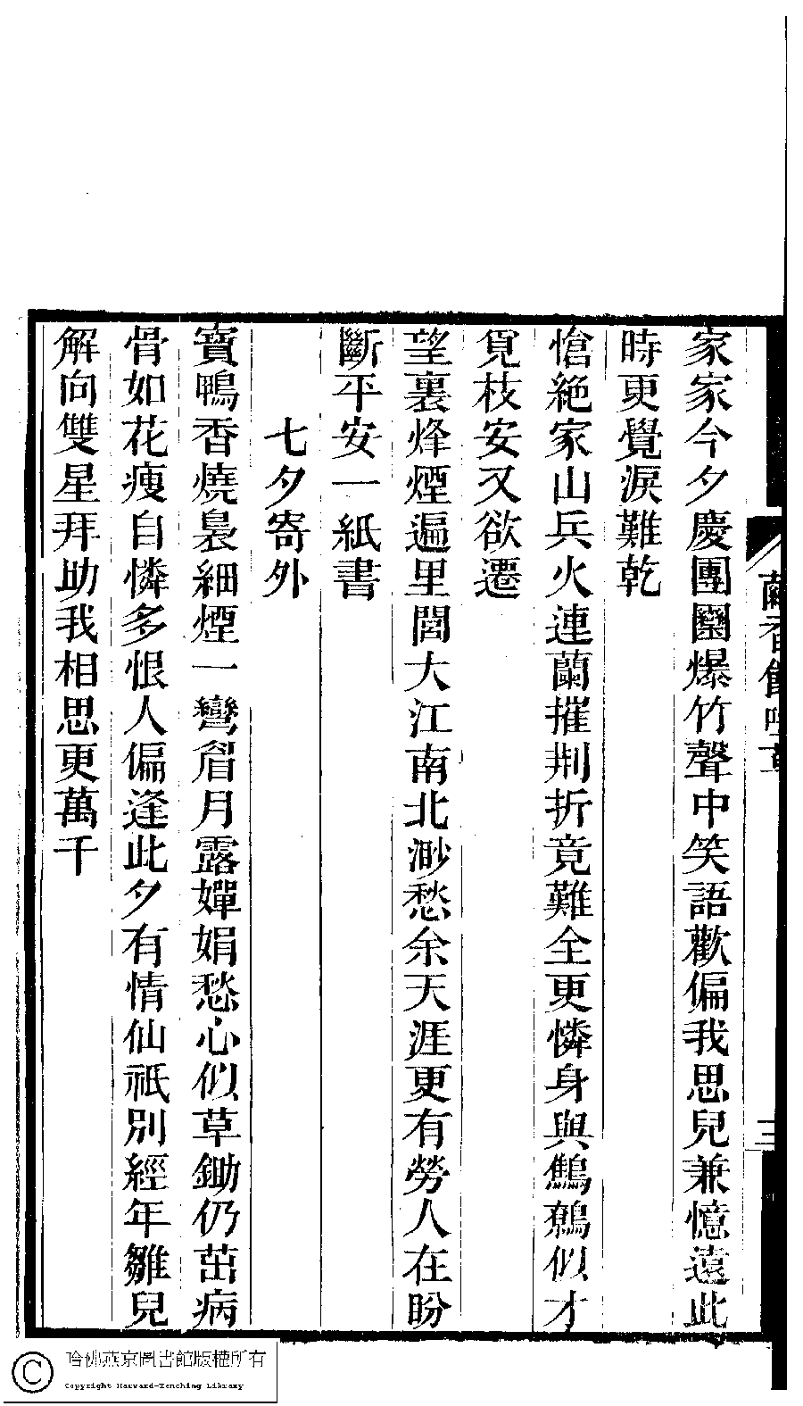 | (PRINT FRIENDLY VERSION) 夢湘樓詩稿﹕二卷﹐詞稿﹕一卷﹔繭香館吟艸﹕一卷﹐繡餘詞草﹕一卷(清宗婉等撰) : 繭香館吟艸﹕一卷。清光緒六年(1880)常熟宗氏刻本 ![]() Page : 12b | click for larger image | 夢湘樓詩稿﹕二卷﹐詞稿﹕一卷﹔繭香館吟艸﹕一卷﹐繡餘詞草﹕一卷(清宗婉等撰) : 繭香館吟艸﹕一卷。清光緒六年(1880)常熟宗氏刻本![]() Page : 12a | click for larger image | Back |