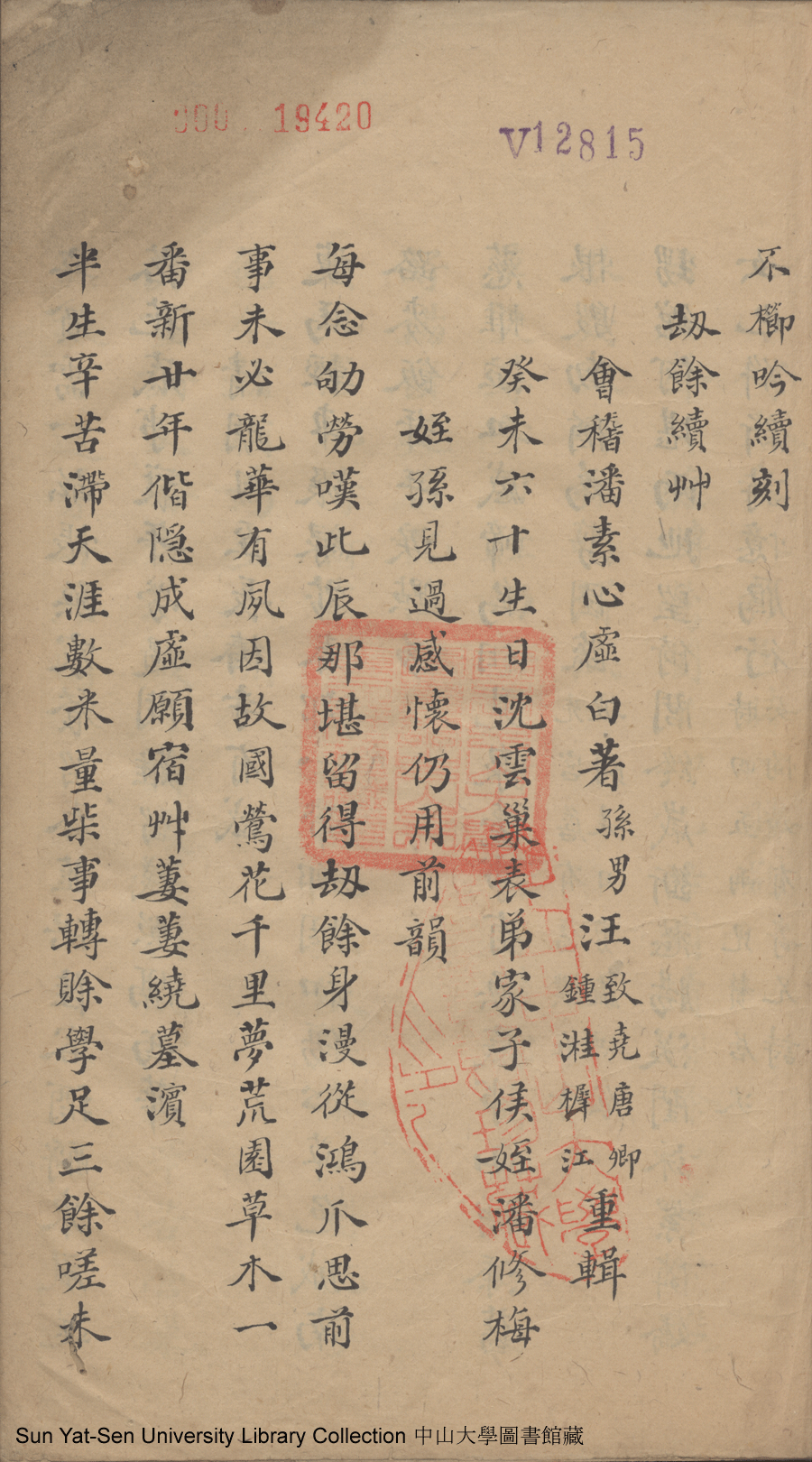 Poem [Gui wei liu shi sheng ri Shen Yunchao biao di jia Zihou zhi Pan Xiumei zhi sun jian guo gan huai reng yong qian yun (er shou)]
