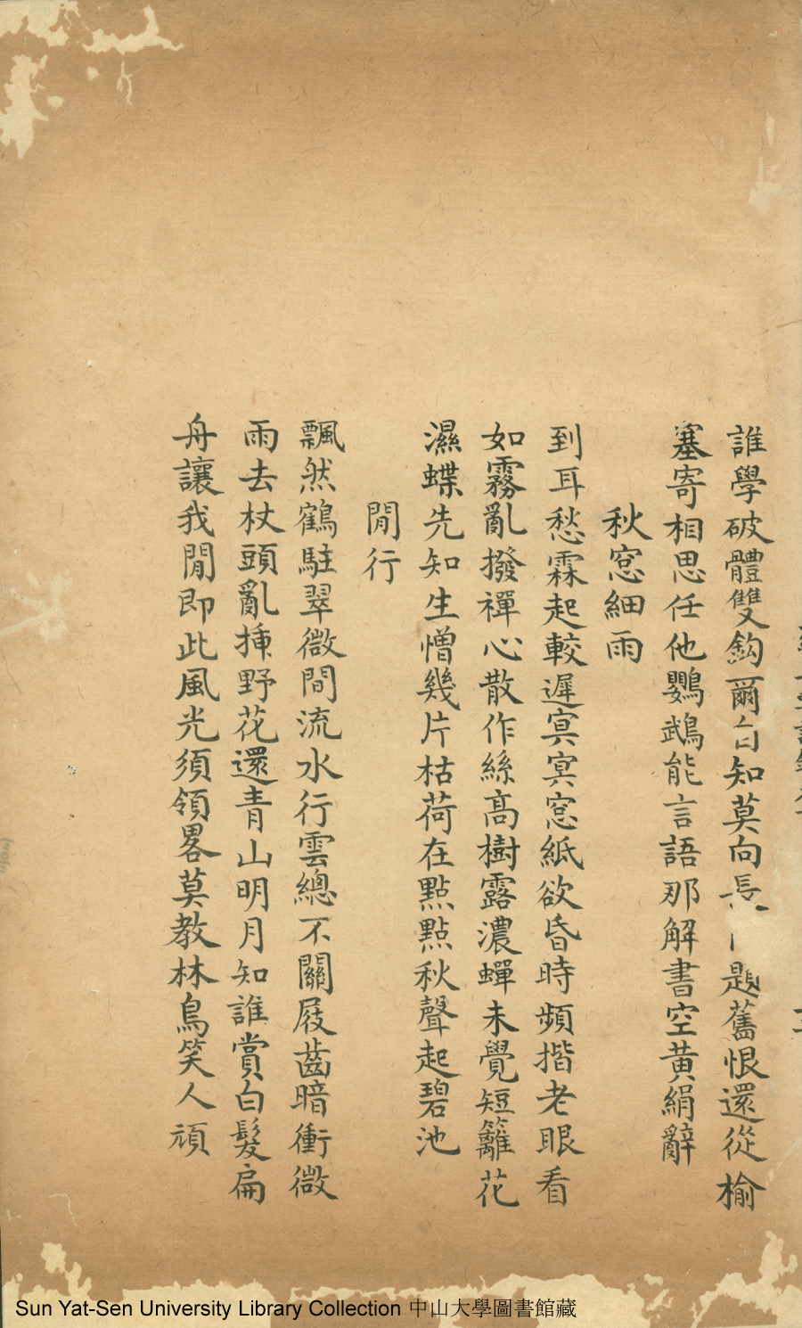 | (PRINT FRIENDLY VERSION) 蘊真軒詩鈔:二卷(清蔡琬撰)。乾隆四十四年己亥(1799)寫刻本 ![]() Page : 卷下12b | click for larger image | Back |
