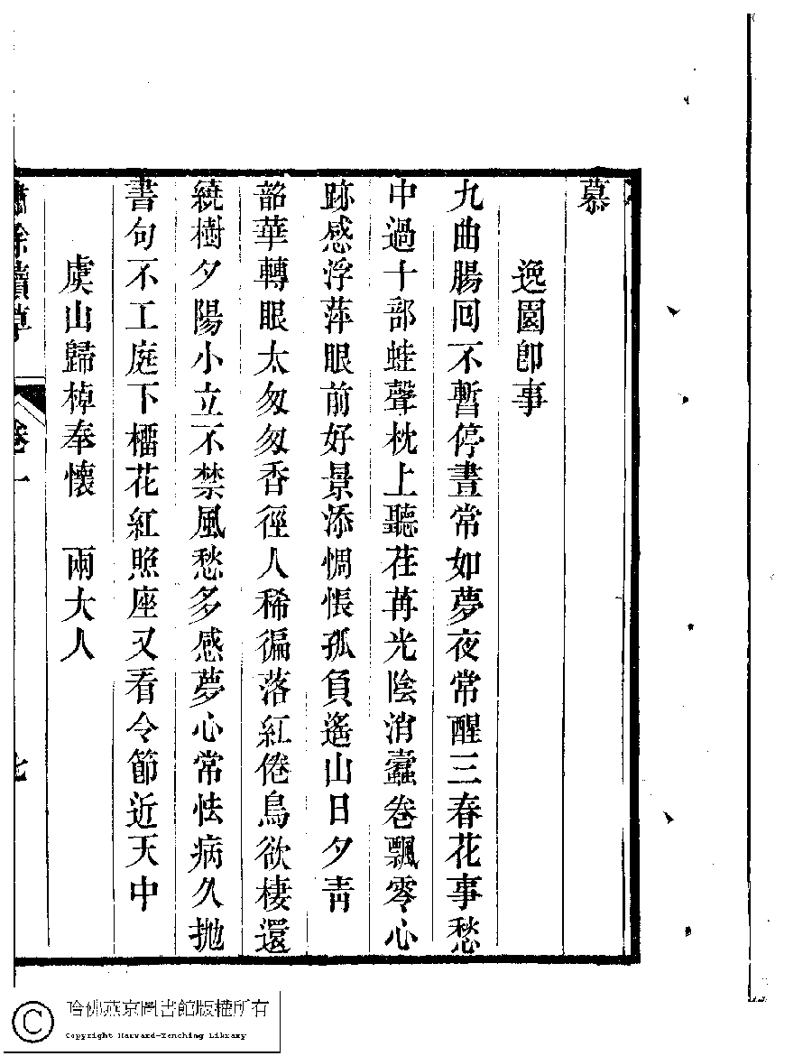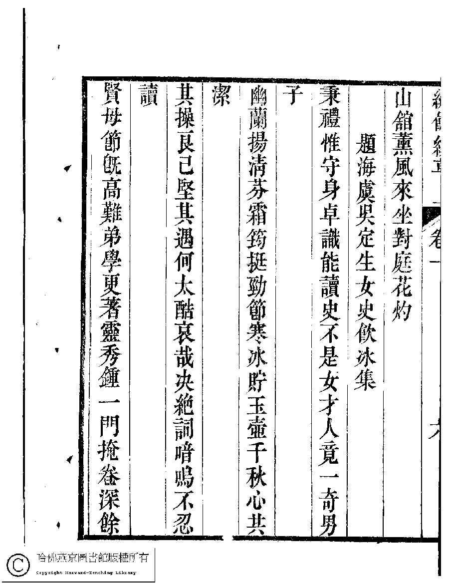 | (PRINT FRIENDLY VERSION) 繡餘續草﹕五卷(清歸懋儀撰)。清道光十二年 (1832)刻本 ![]() Page : 1.7a | click for larger image | 繡餘續草﹕五卷(清歸懋儀撰)。清道光十二年 (1832)刻本![]() Page : 1.6b | click for larger image | Back |