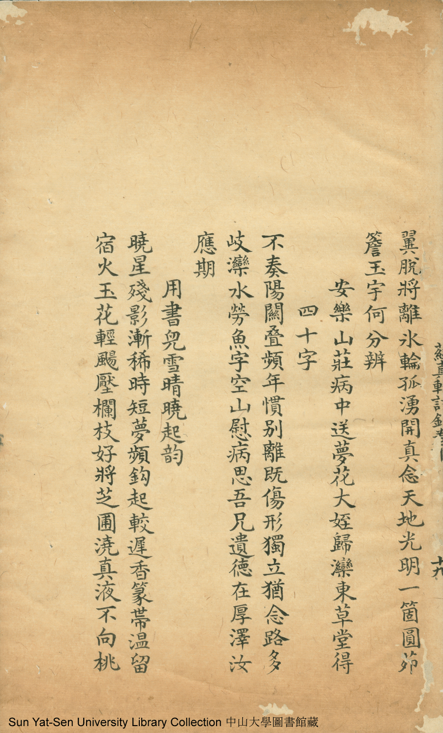 | (PRINT FRIENDLY VERSION) 蘊真軒詩鈔:二卷(清蔡琬撰)。乾隆四十四年己亥(1799)寫刻本 ![]() Page : 卷下19b | click for larger image | Back |