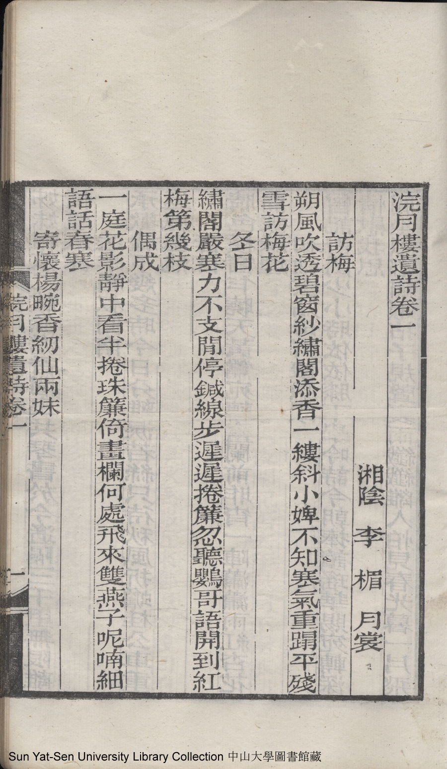 | (PRINT FRIENDLY VERSION) 浣月樓遺詩:二卷(清李楣撰)。清光緒九年(1883)後刻本 ![]() Page : 浣詩卷一1b | click for larger image | 浣月樓遺詩:二卷(清李楣撰)。清光緒九年(1883)後刻本![]() Page : 浣詩卷一1a | click for larger image | Back |