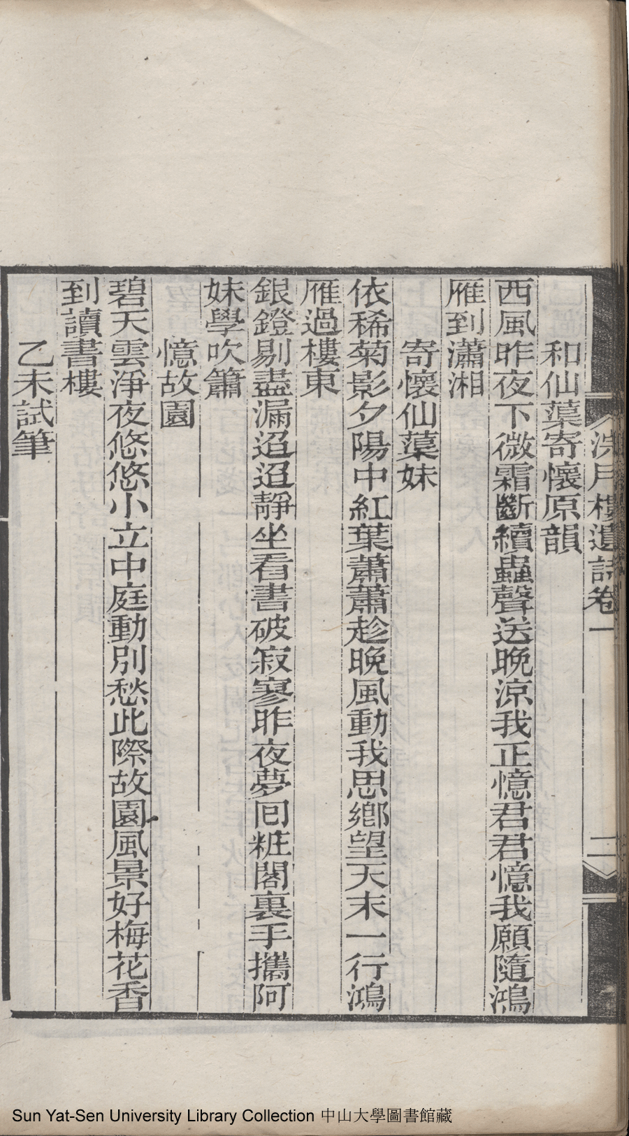 | (PRINT FRIENDLY VERSION) 浣月樓遺詩:二卷(清李楣撰)。清光緒九年(1883)後刻本 ![]() Page : 浣詩卷一2b | click for larger image | Back |