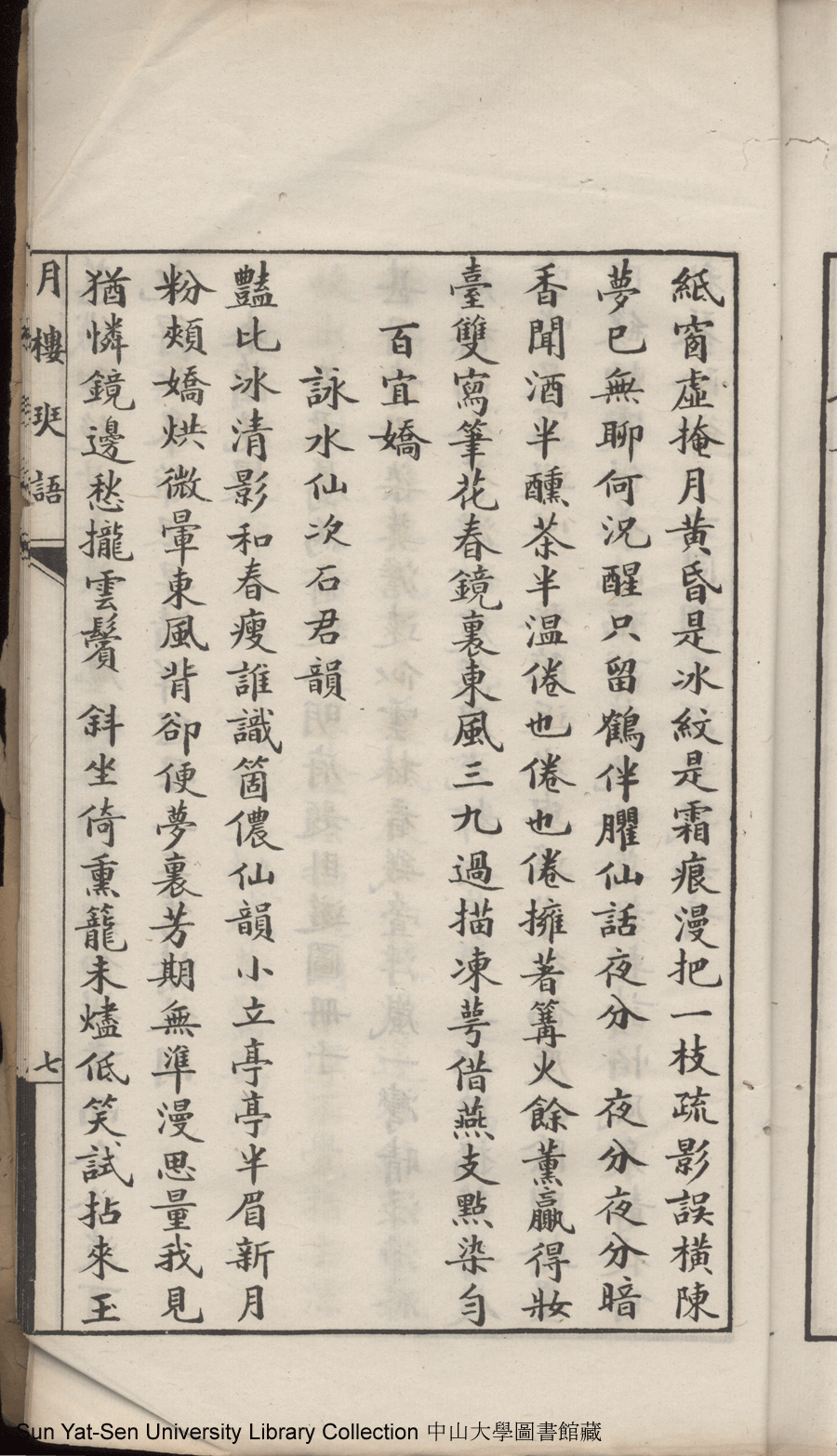 | (PRINT FRIENDLY VERSION) 月樓琴語: 一卷(清蕭恆貞撰)。清光緒十七年(1891)石印本 ![]() Page : 月樓琴語7b | click for larger image | 月樓琴語: 一卷(清蕭恆貞撰)。清光緒十七年(1891)石印本![]() Page : 月樓琴語7a | click for larger image | Back |