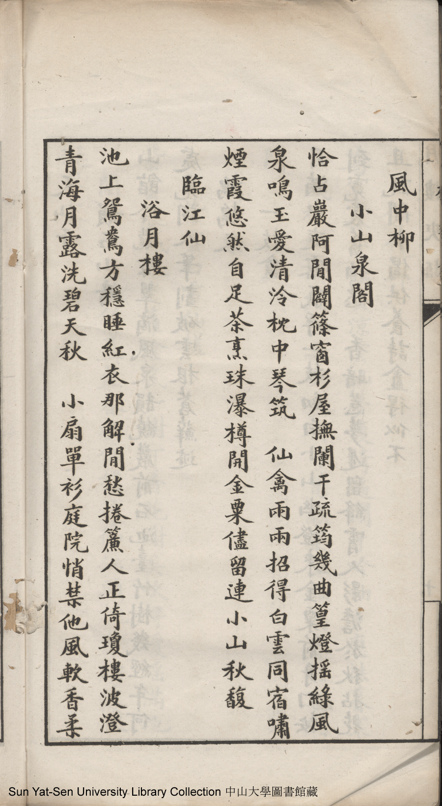| (PRINT FRIENDLY VERSION) 月樓琴語: 一卷(清蕭恆貞撰)。清光緒十七年(1891)石印本 ![]() Page : 月樓琴語10b | click for larger image | Back |