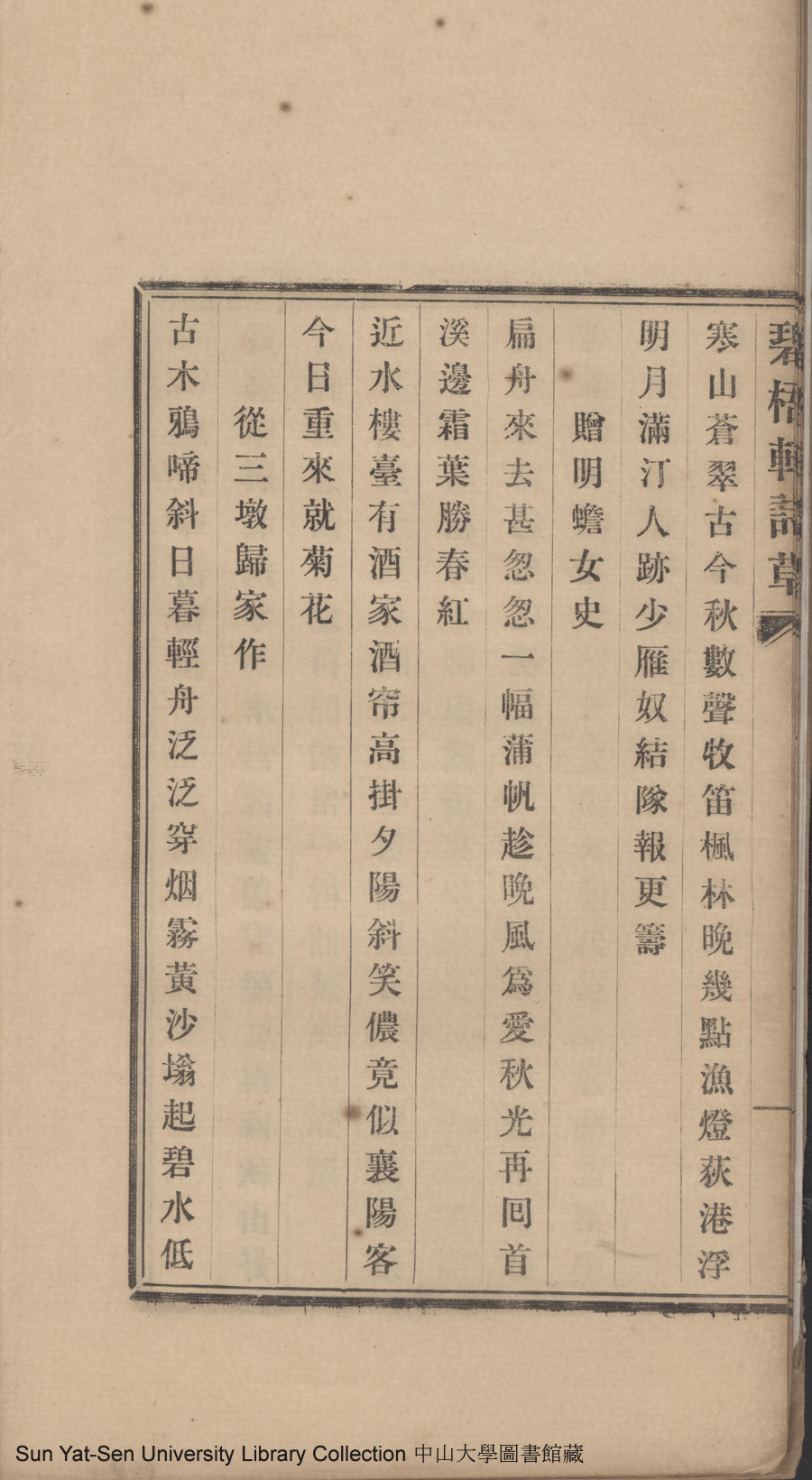 | (PRINT FRIENDLY VERSION) 碧梧軒詩草:一卷(清許桐撰)。民國二十六年(1927)鉛印本 ![]() Page : 詩草3b | click for larger image | Back |
