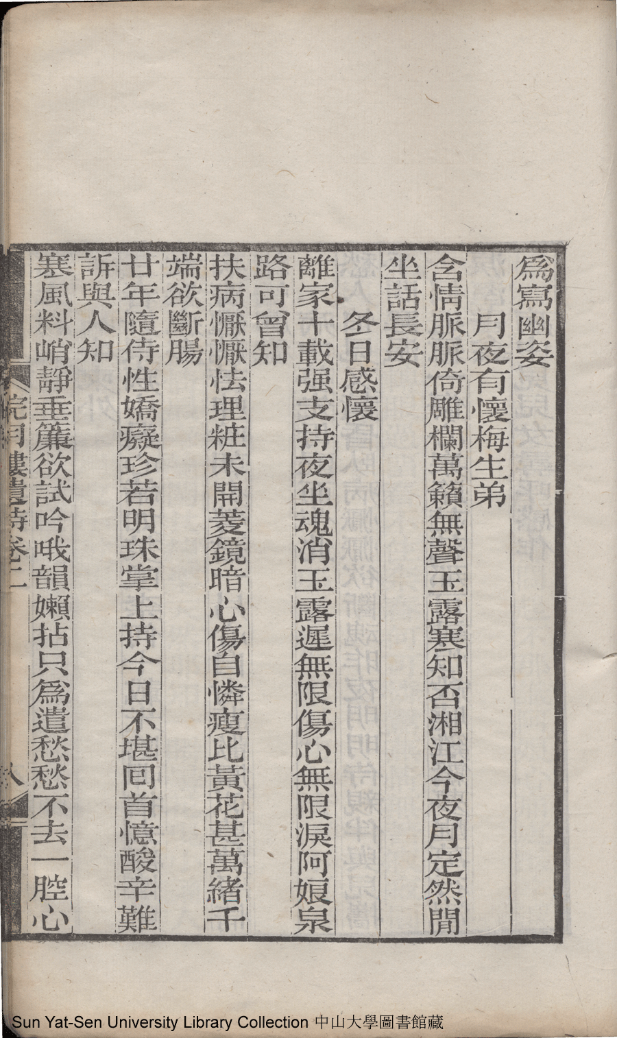 | (PRINT FRIENDLY VERSION) 浣月樓遺詩:二卷(清李楣撰)。清光緒九年(1883)後刻本 ![]() Page : 浣詩卷二8a | click for larger image | Back |