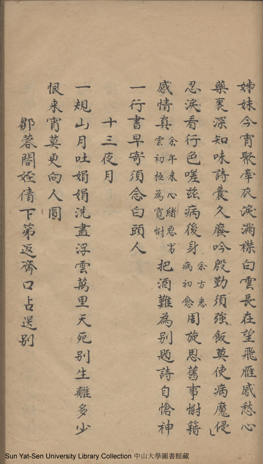 | (PRINT FRIENDLY VERSION) 不櫛吟續刻: 不分卷,不櫛吟未刻稿: 不分卷(清潘素心撰)。晚清(1843-1911)抄本 ![]() Page : 續刻27a | click for larger image | Back |