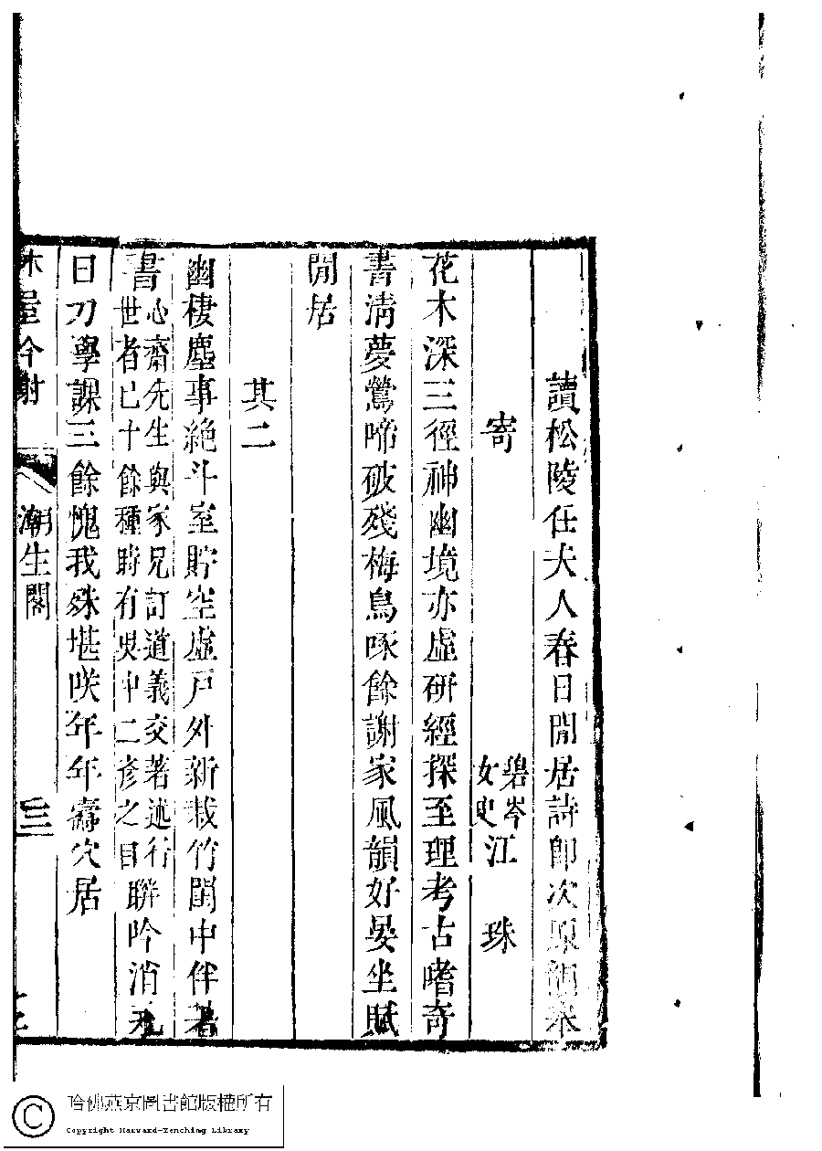 | (PRINT FRIENDLY VERSION) 吳中女士詩鈔(清任兆麟輯,張滋蘭選) : 清溪詩稿﹕一卷。清乾隆五十四年(1789)刻本 ![]() Page : 潮生阁.3b | click for larger image | 吳中女士詩鈔(清任兆麟輯,張滋蘭選) : 清溪詩稿﹕一卷。清乾隆五十四年(1789)刻本![]() Page : 潮生阁.3a | click for larger image | Back |