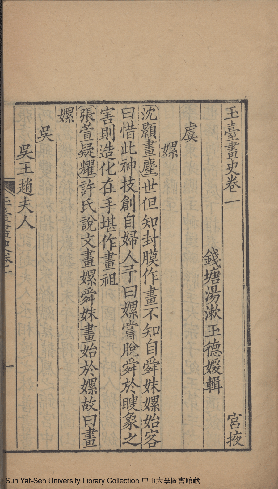 | (PRINT FRIENDLY VERSION) 玉臺畫史:五卷,別錄:一卷(清湯漱玉輯)。清道光十一年(1831)錢塘汪氏振綺堂刻本 ![]() Page : 卷一1a | click for larger image | Back |
