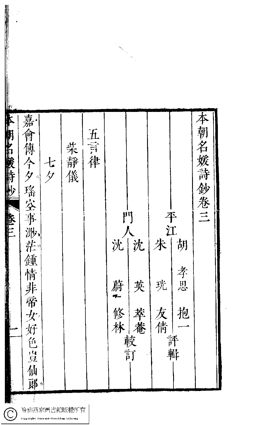 | (PRINT FRIENDLY VERSION) 本朝名媛詩鈔﹕六卷(清胡孝思輯)。清康熙五十五年(1716)凌雲閣刻本 ![]() Page : 3.1b | click for larger image | 本朝名媛詩鈔﹕六卷(清胡孝思輯)。清康熙五十五年(1716)凌雲閣刻本![]() Page : 3.1a | click for larger image | Back |