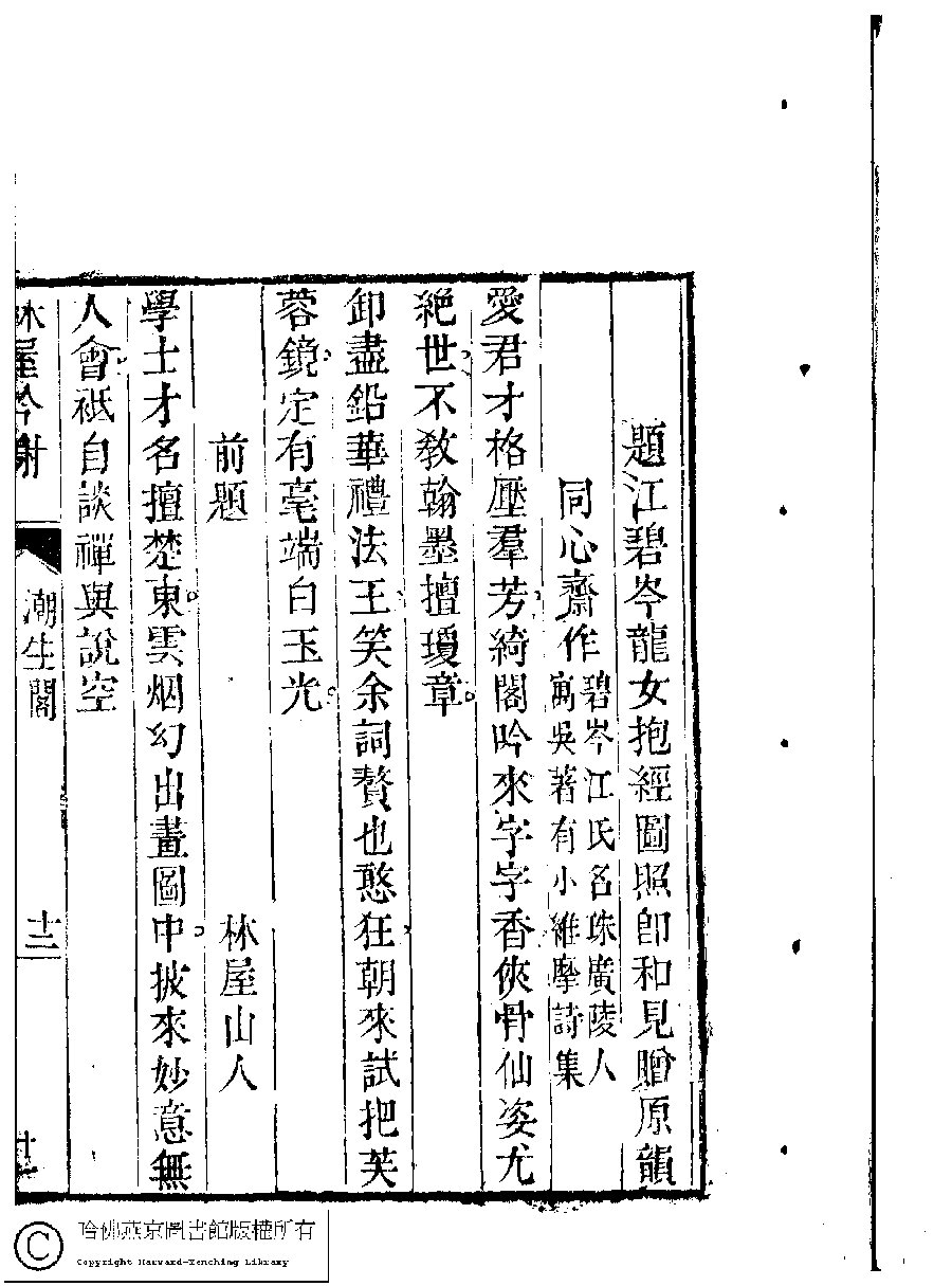 | (PRINT FRIENDLY VERSION) 吳中女士詩鈔(清任兆麟輯,張滋蘭選)。清乾隆五十四年(1789)刻本 ![]() Page : 潮生阁.12a | click for larger image | Back |