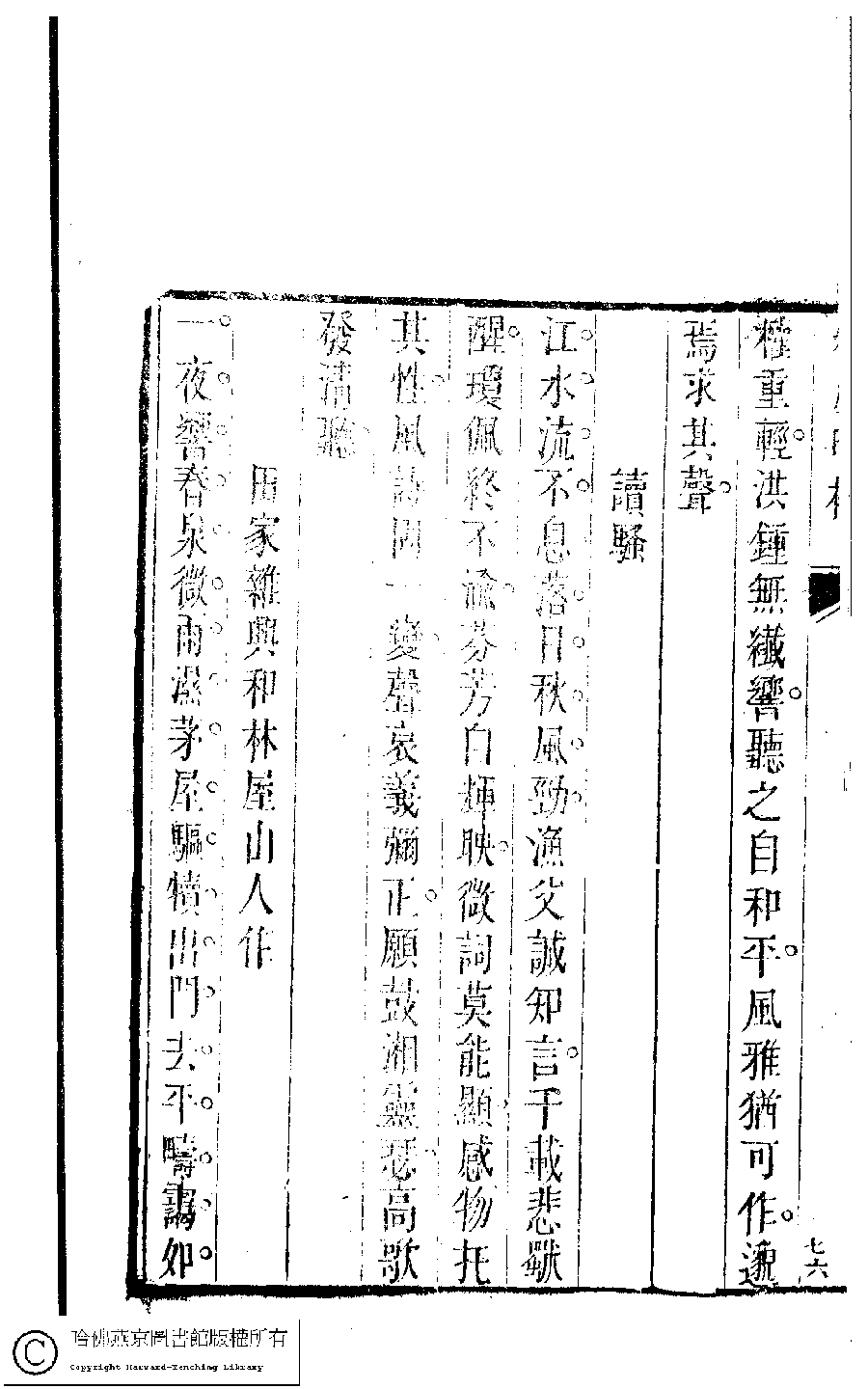 | (PRINT FRIENDLY VERSION) 吳中女士詩鈔(清任兆麟輯,張滋蘭選) : 翡翠樓集﹕一卷﹐浣紗詞﹕一卷。清乾隆五十四年(1789)刻本 ![]() Page : 翡翠樓.3b | click for larger image | 吳中女士詩鈔(清任兆麟輯,張滋蘭選)。清乾隆五十四年(1789)刻本![]() Page : 翡翠樓.3b | click for larger image | Back |