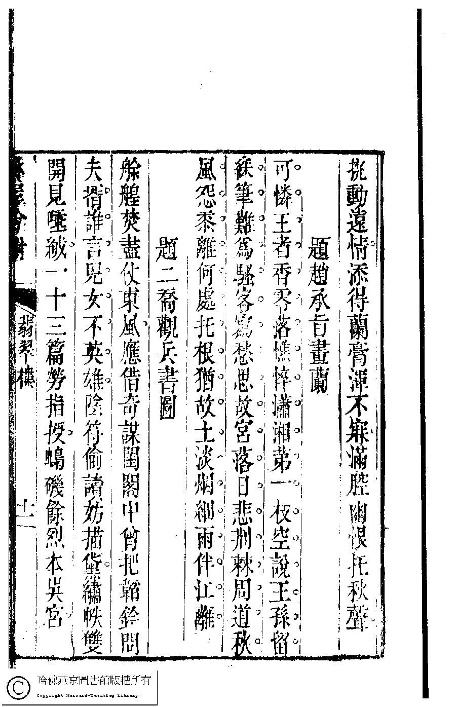 | (PRINT FRIENDLY VERSION) 吳中女士詩鈔(清任兆麟輯,張滋蘭選) : 翡翠樓集﹕一卷﹐浣紗詞﹕一卷。清乾隆五十四年(1789)刻本 ![]() Page : 翡翠樓.11a | click for larger image | Back |