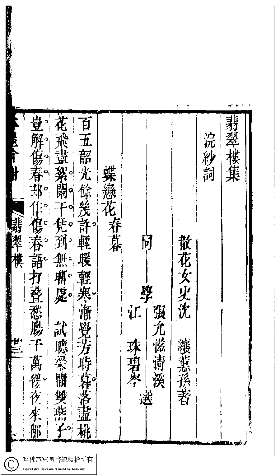 | Appears in: Wu zhong nü shi shi chao (edited by Ren Zhaolin, Qing dynasty): Fei cui lou ji: 1 juan, huan sha ci: 1 juan |