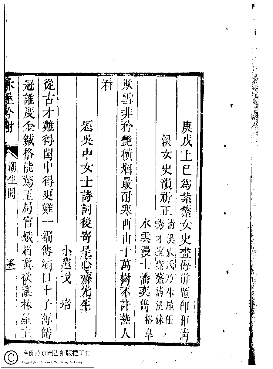 | (PRINT FRIENDLY VERSION) 吳中女士詩鈔(清任兆麟輯,張滋蘭選) : 清溪詩稿﹕一卷。清乾隆五十四年(1789)刻本 ![]() Page : 潮生阁.15a | click for larger image | Back |