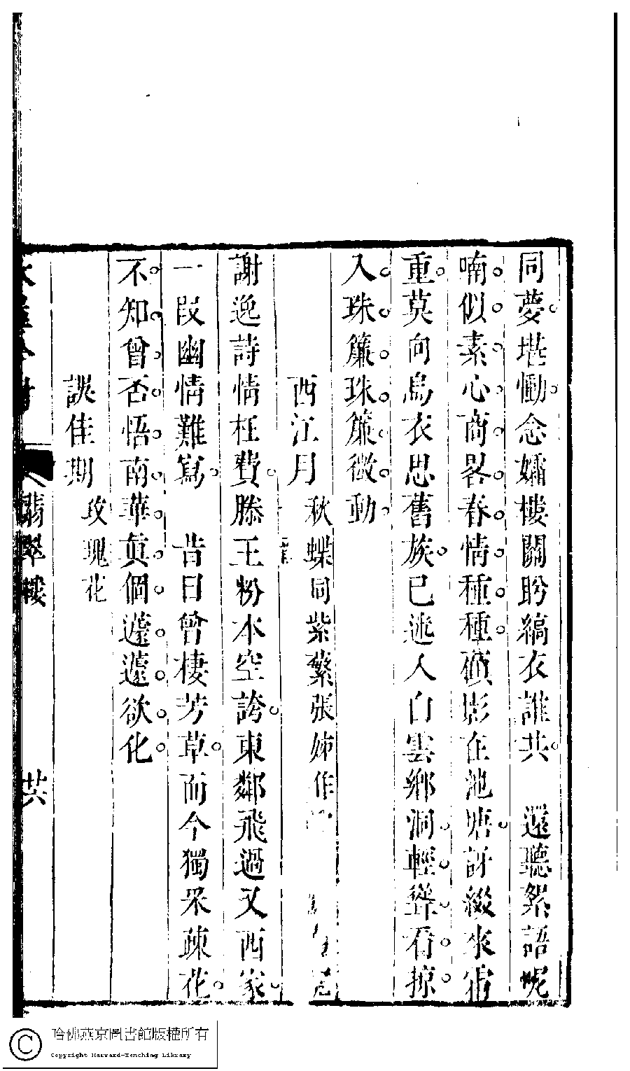 | (PRINT FRIENDLY VERSION) 吳中女士詩鈔(清任兆麟輯,張滋蘭選) : 翡翠樓集﹕一卷﹐浣紗詞﹕一卷。清乾隆五十四年(1789)刻本 ![]() Page : 翡翠樓.26a | click for larger image | Back |