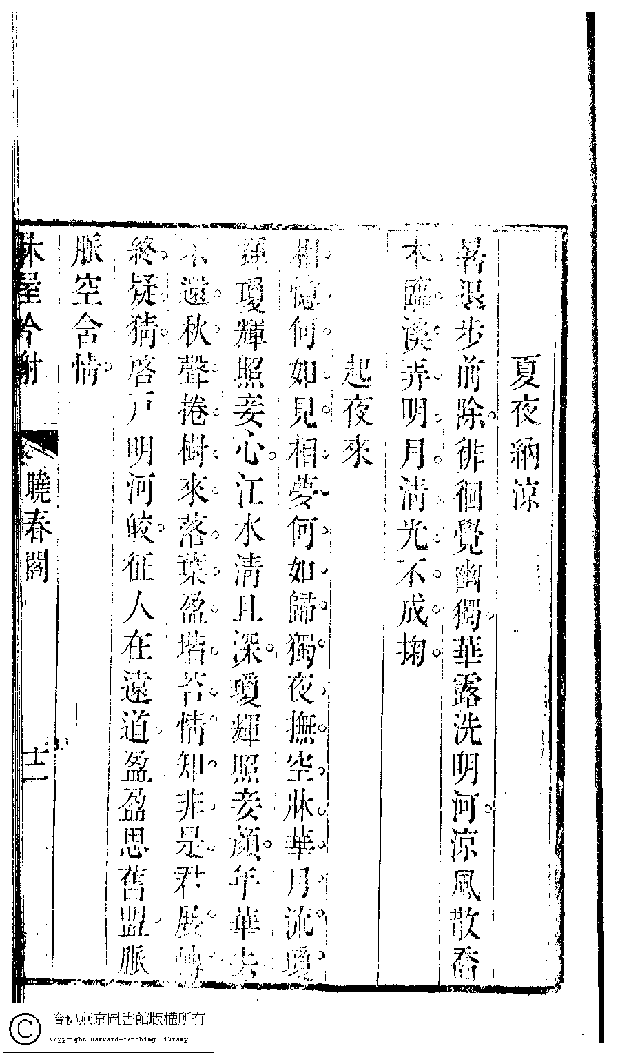 | (PRINT FRIENDLY VERSION) 吳中女士詩鈔(清任兆麟輯,張滋蘭選) : 曉春閣詩稿﹕一卷。清乾隆五十四年(1789)刻本 ![]() Page : 曉春閣.12a | click for larger image | Back |