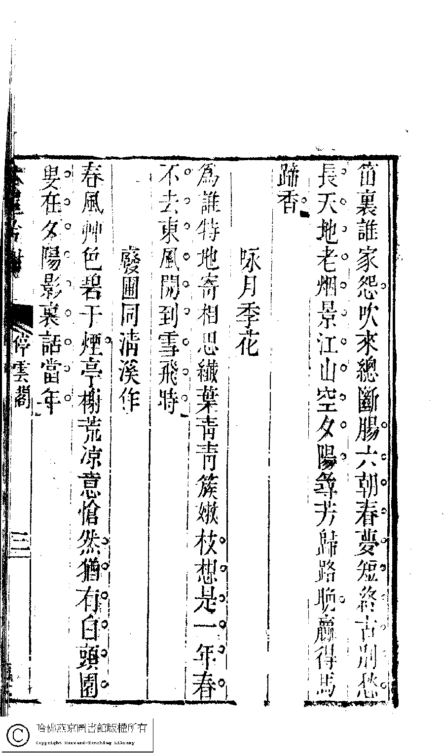 | (PRINT FRIENDLY VERSION) 吳中女士詩鈔(清任兆麟輯,張滋蘭選) : 停雲閣詩稿﹕一卷。清乾隆五十四年(1789)刻本 ![]() Page : 停雲閣.3a | click for larger image | Back |