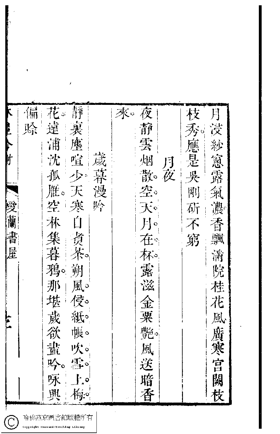| (PRINT FRIENDLY VERSION) 吳中女士詩鈔(清任兆麟輯,張滋蘭選) : 愛蘭詩鈔﹕一卷。清乾隆五十四年(1789)刻本 ![]() Page : 愛蘭書屋.3a | click for larger image | Back |