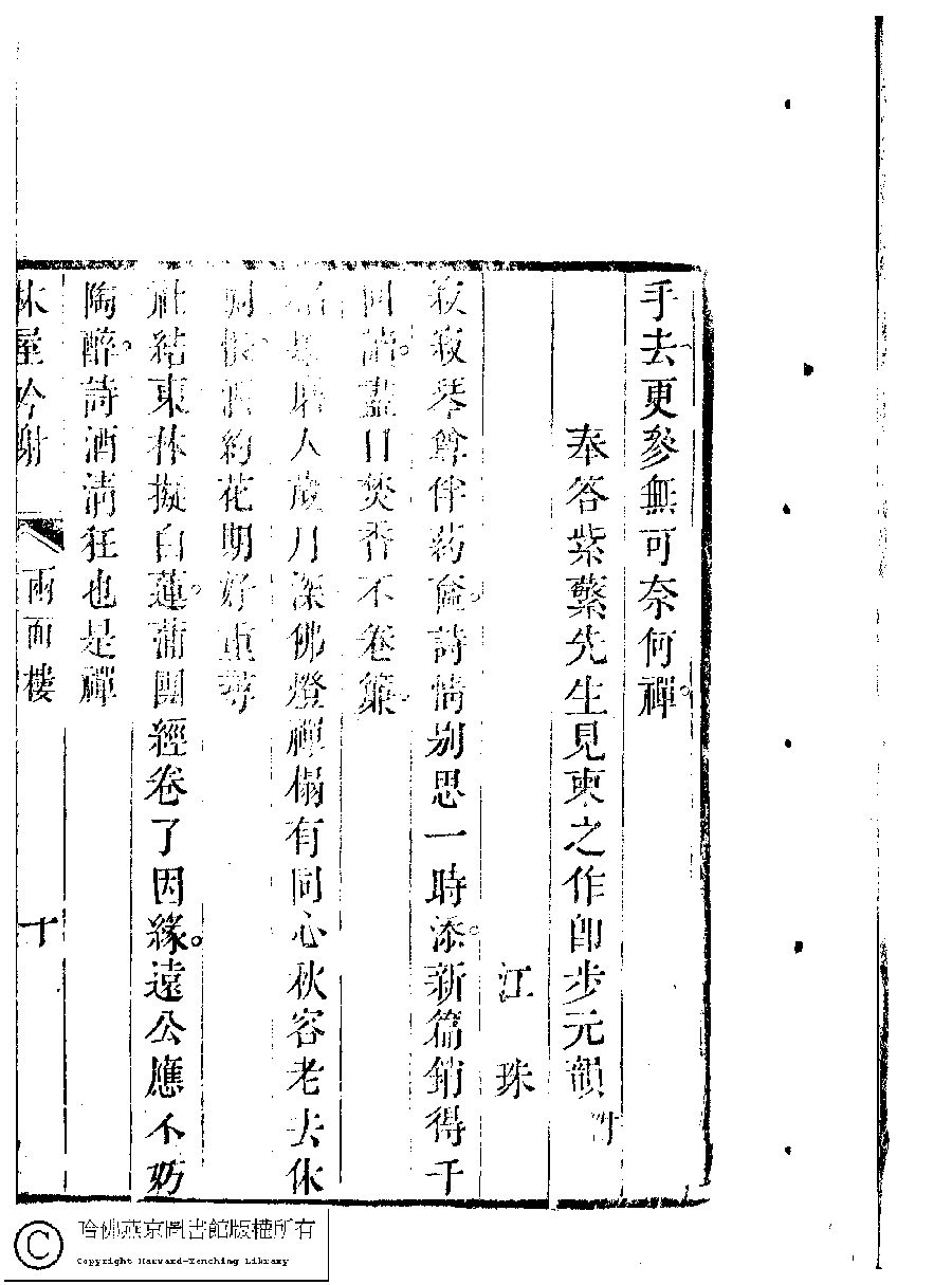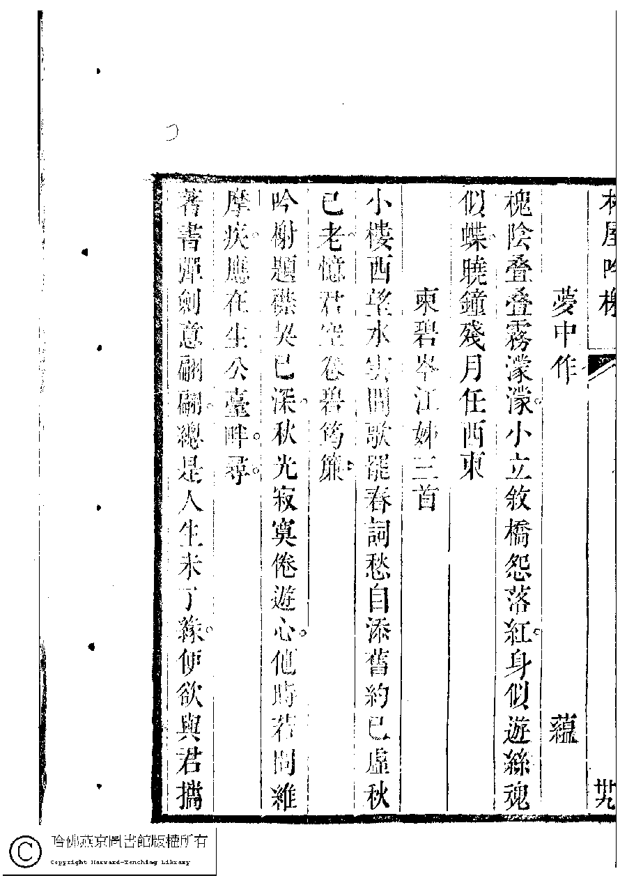 | (PRINT FRIENDLY VERSION) 吳中女士詩鈔(清任兆麟輯,張滋蘭選) : 兩面樓詩稿﹕一卷。清乾隆五十四年(1789)刻本 ![]() Page : 兩面樓.10a | click for larger image | 吳中女士詩鈔(清任兆麟輯,張滋蘭選) : 兩面樓詩稿﹕一卷。清乾隆五十四年(1789)刻本![]() Page : 兩面樓.9b | click for larger image | Back |