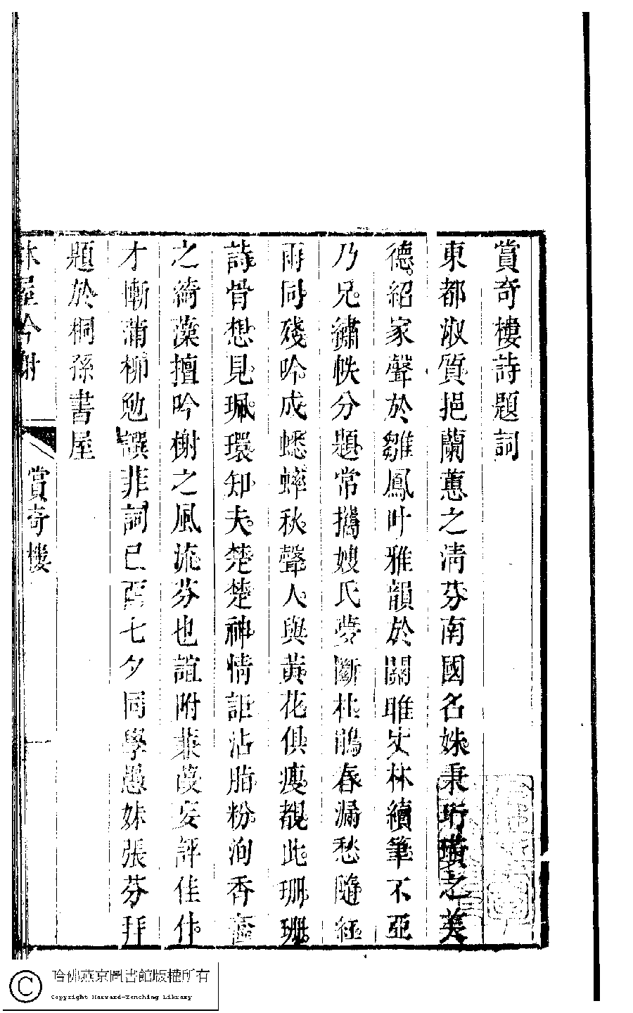 | (PRINT FRIENDLY VERSION) 吳中女士詩鈔(清任兆麟輯,張滋蘭選) : 賞奇樓蠹餘稿﹕一卷。清乾隆五十四年(1789)刻本 ![]() Page : 賞奇樓.1b | click for larger image | Back |