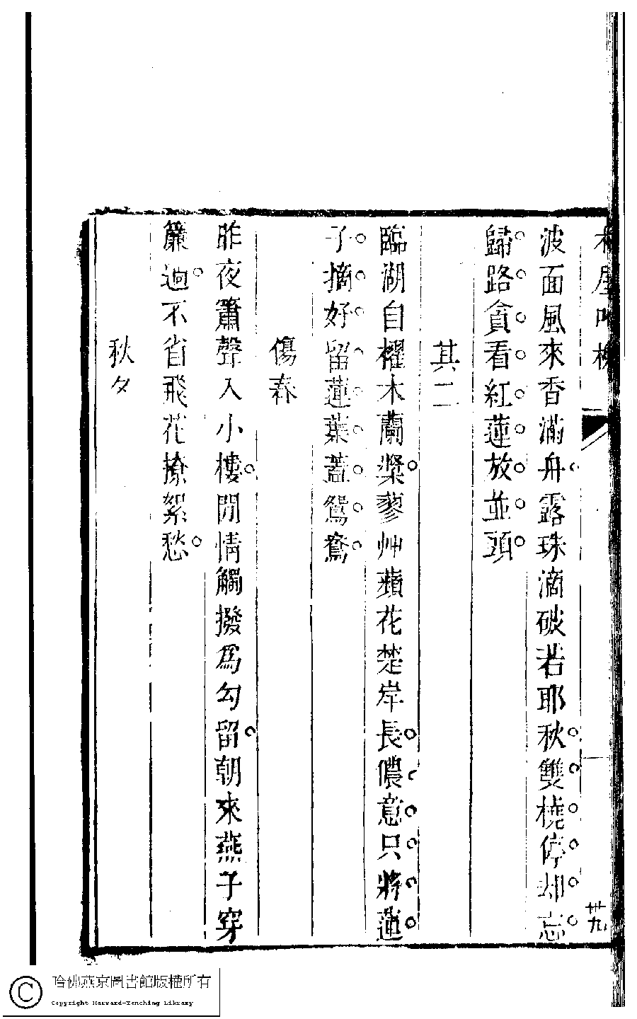 | (PRINT FRIENDLY VERSION) 吳中女士詩鈔(清任兆麟輯,張滋蘭選) : 琴好樓小製﹕一卷。清乾隆五十四年(1789)刻本 ![]() Page : 琴好樓.2b | click for larger image | Back |
