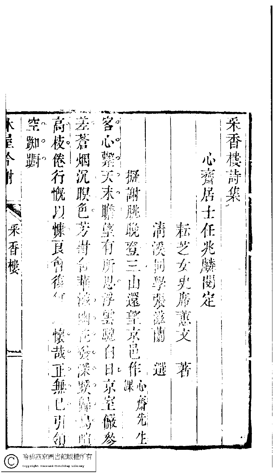 | (PRINT FRIENDLY VERSION) 吳中女士詩鈔(清任兆麟輯,張滋蘭選) : 采香樓詩集﹕一卷。清乾隆五十四年(1789)刻本 ![]() Page : 采香樓.1a | click for larger image | Back |