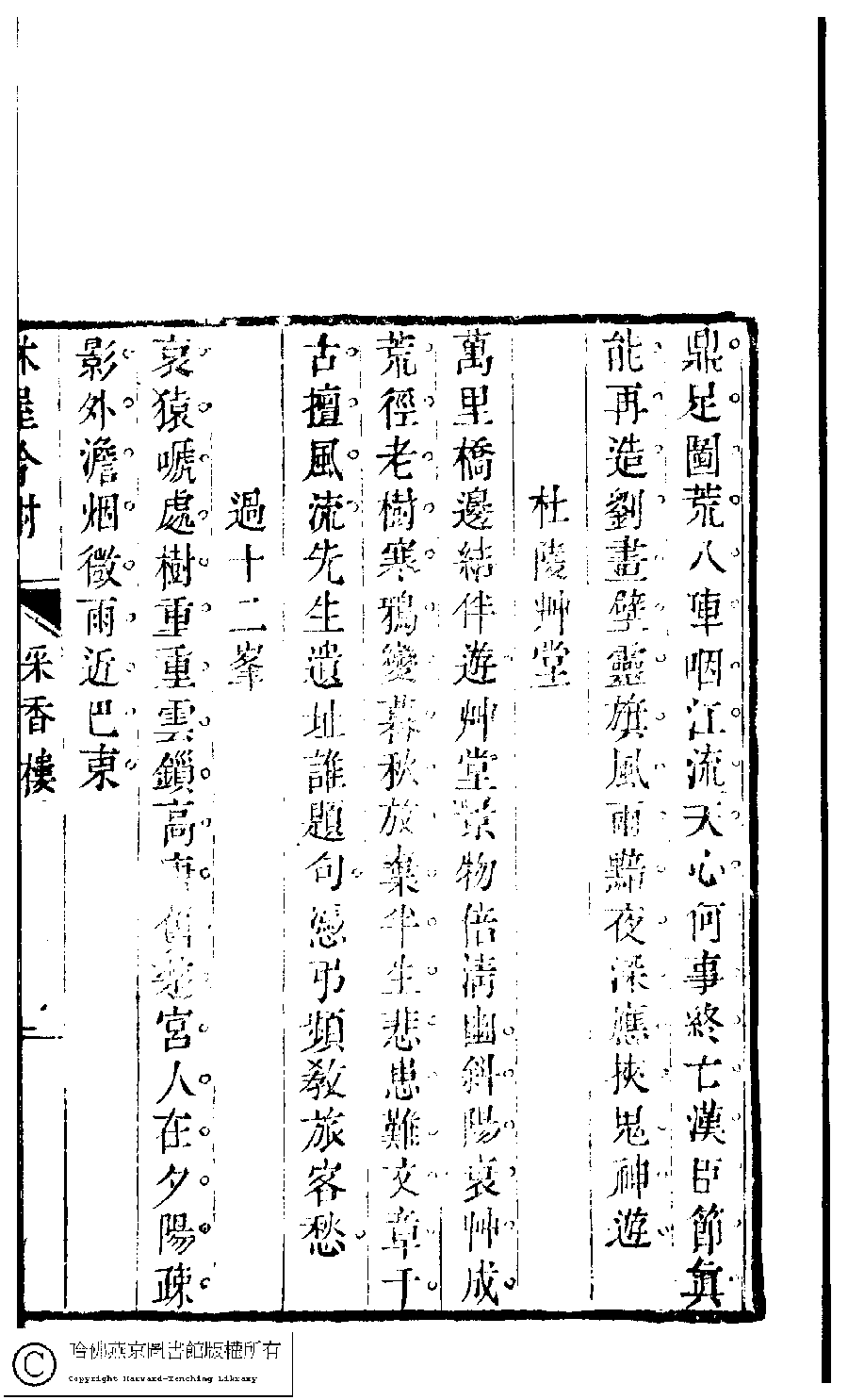 | (PRINT FRIENDLY VERSION) 吳中女士詩鈔(清任兆麟輯,張滋蘭選) : 采香樓詩集﹕一卷。清乾隆五十四年(1789)刻本 ![]() Page : 采香樓.2a | click for larger image | Back |