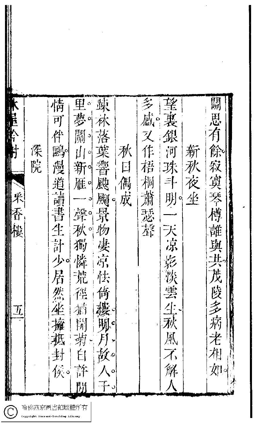 | (PRINT FRIENDLY VERSION) 吳中女士詩鈔(清任兆麟輯,張滋蘭選) : 采香樓詩集﹕一卷。清乾隆五十四年(1789)刻本 ![]() Page : 采香樓.5a | click for larger image | 吳中女士詩鈔(清任兆麟輯,張滋蘭選) : 采香樓詩集﹕一卷。清乾隆五十四年(1789)刻本![]() Page : 采香樓.4b | click for larger image | Back |
