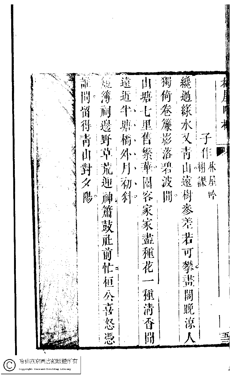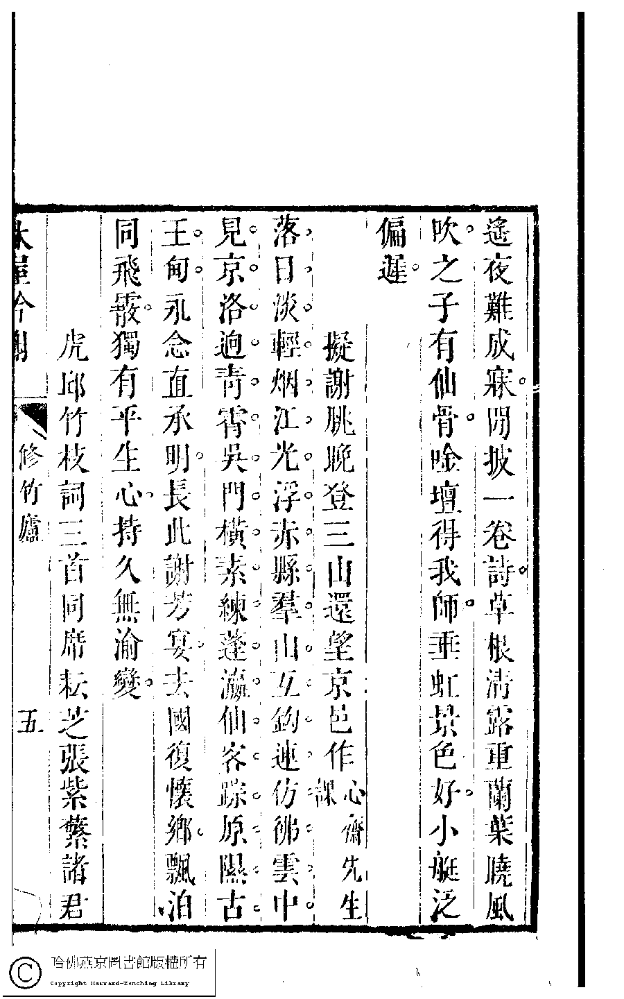 | (PRINT FRIENDLY VERSION) 吳中女士詩鈔(清任兆麟輯,張滋蘭選) : 修竹廬吟稿﹕一卷。清乾隆五十四年(1789)刻本 ![]() Page : 修竹廬.5c | click for larger image | 吳中女士詩鈔(清任兆麟輯,張滋蘭選) : 修竹廬吟稿﹕一卷。清乾隆五十四年(1789)刻本![]() Page : 修竹廬.5b | click for larger image | 吳中女士詩鈔(清任兆麟輯,張滋蘭選) : 修竹廬吟稿﹕一卷。清乾隆五十四年(1789)刻本![]() Page : 修竹廬.5a | click for larger image | Back |