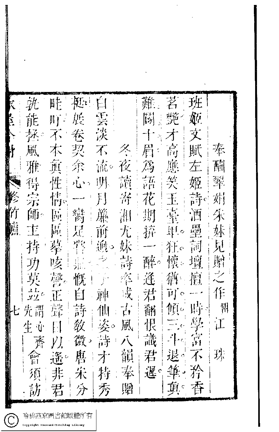 | (PRINT FRIENDLY VERSION) 吳中女士詩鈔(清任兆麟輯,張滋蘭選) : 修竹廬吟稿﹕一卷。清乾隆五十四年(1789)刻本 ![]() Page : 修竹廬.7a | click for larger image | Back |