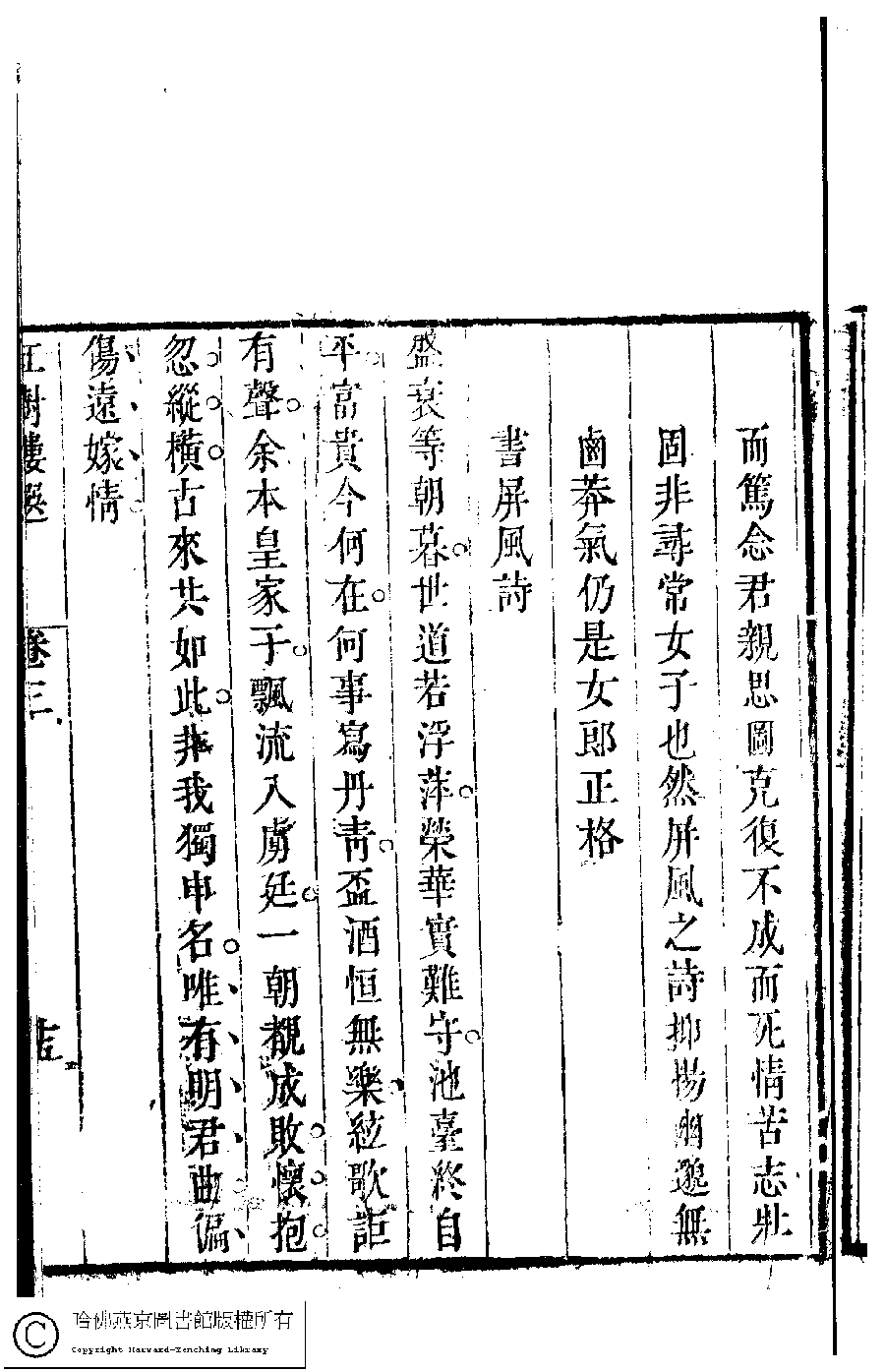 | (PRINT FRIENDLY VERSION) 歷朝名媛詩詞﹕十二卷(清陸昶輯)。清乾隆三十八年(1773)紅樹樓刻本 ![]() Page : 3.15a | click for larger image | 歷朝名媛詩詞﹕十二卷(清陸昶輯)。清乾隆三十八年(1773)紅樹樓刻本![]() Page : 3.14b | click for larger image | Back |