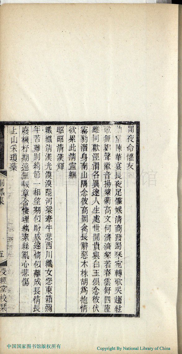 | (PRINT FRIENDLY VERSION) 桐鳳集:二卷(清曾彥季撰)。蘇州書局清光緒十五年(1889)刻本 ![]() Page : 1.5a | click for larger image | Back |