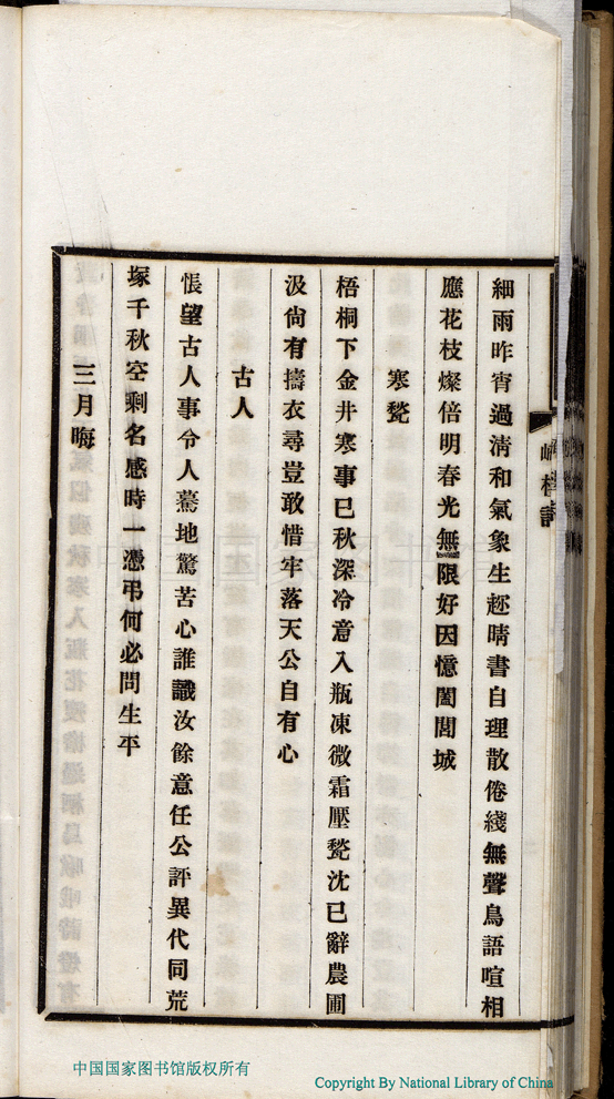 | (PRINT FRIENDLY VERSION) 崦樓遺稿:二卷(清沈鵲應撰)。民國間(1912-1949)鉛印本 ![]() Page : 崦樓詩.2b | click for larger image | 崦樓遺稿:二卷(清沈鵲應撰)。民國間(1912-1949)鉛印本![]() Page : 崦樓詩.2a | click for larger image | Back |