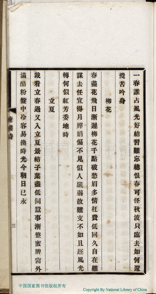 | (PRINT FRIENDLY VERSION) 崦樓遺稿:二卷(清沈鵲應撰)。民國間(1912-1949)鉛印本 ![]() Page : 崦樓詩.3a | click for larger image | Back |