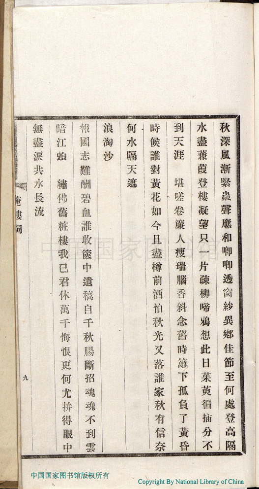 | (PRINT FRIENDLY VERSION) 崦樓遺稿:二卷(清沈鵲應撰)。民國間(1912-1949)鉛印本 ![]() Page : 崦樓詞.9a | click for larger image | Back |