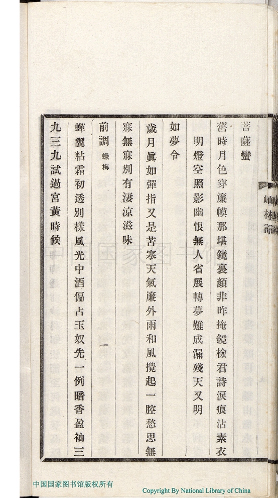 | (PRINT FRIENDLY VERSION) 崦樓遺稿:二卷(清沈鵲應撰)。民國間(1912-1949)鉛印本 ![]() Page : 崦樓詞.9b | click for larger image | Back |