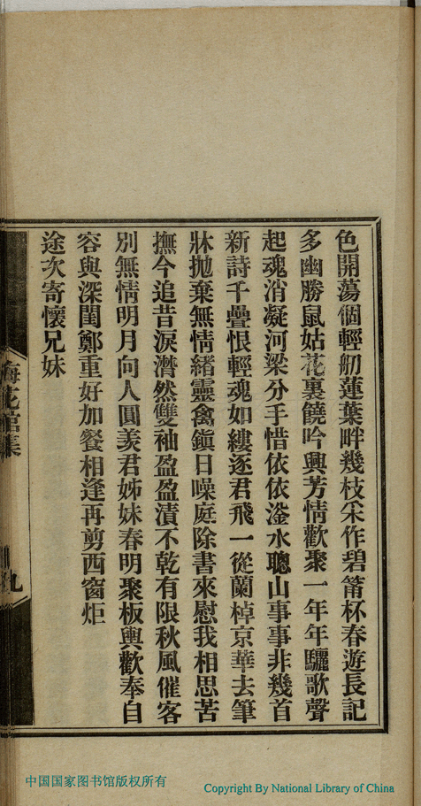 | (PRINT FRIENDLY VERSION) 梅花館詩集:一卷;附詩餘(清汪韻梅撰)。清光緒三十四年(1908)排印本 ![]() Page : 詩集.9b | click for larger image | 梅花館詩集:一卷;附詩餘(清汪韻梅撰)。清光緒三十四年(1908)排印本![]() Page : 詩集.9a | click for larger image | Back |
