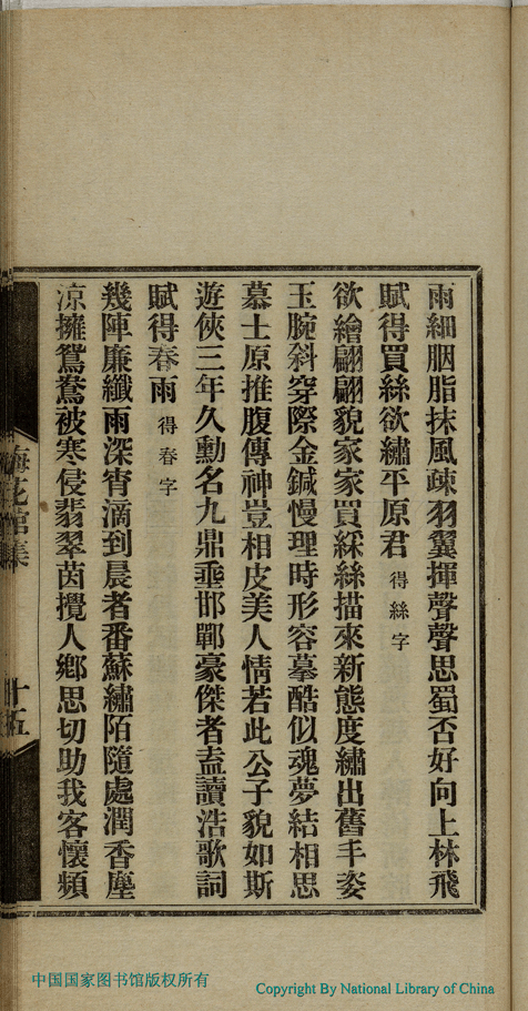 | (PRINT FRIENDLY VERSION) 梅花館詩集:一卷;附詩餘(清汪韻梅撰)。清光緒三十四年(1908)排印本 ![]() Page : 詩集.15b | click for larger image | 梅花館詩集:一卷;附詩餘(清汪韻梅撰)。清光緒三十四年(1908)排印本![]() Page : 詩集.15a | click for larger image | Back |