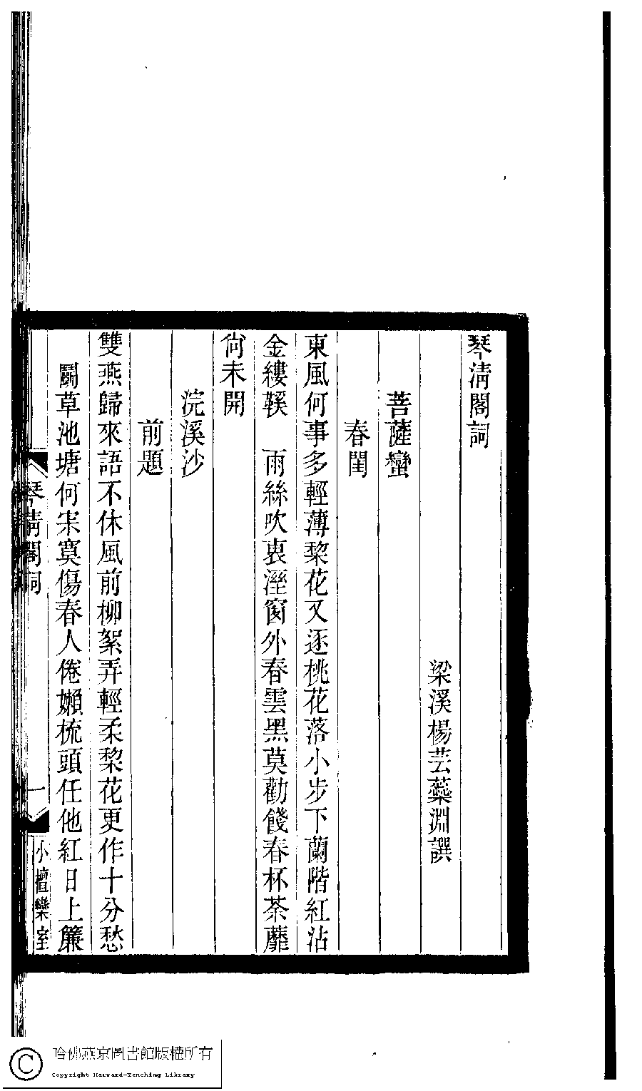 | (PRINT FRIENDLY VERSION) 小檀欒室彙刻閨秀詞﹕十集一百種一百卷(清徐乃昌輯) : 琴清閣詞﹕一卷。清光緒二十二年(1896)南陵徐氏刻本。 ![]() Page : 琴清閣詞.1a | click for larger image | Back |