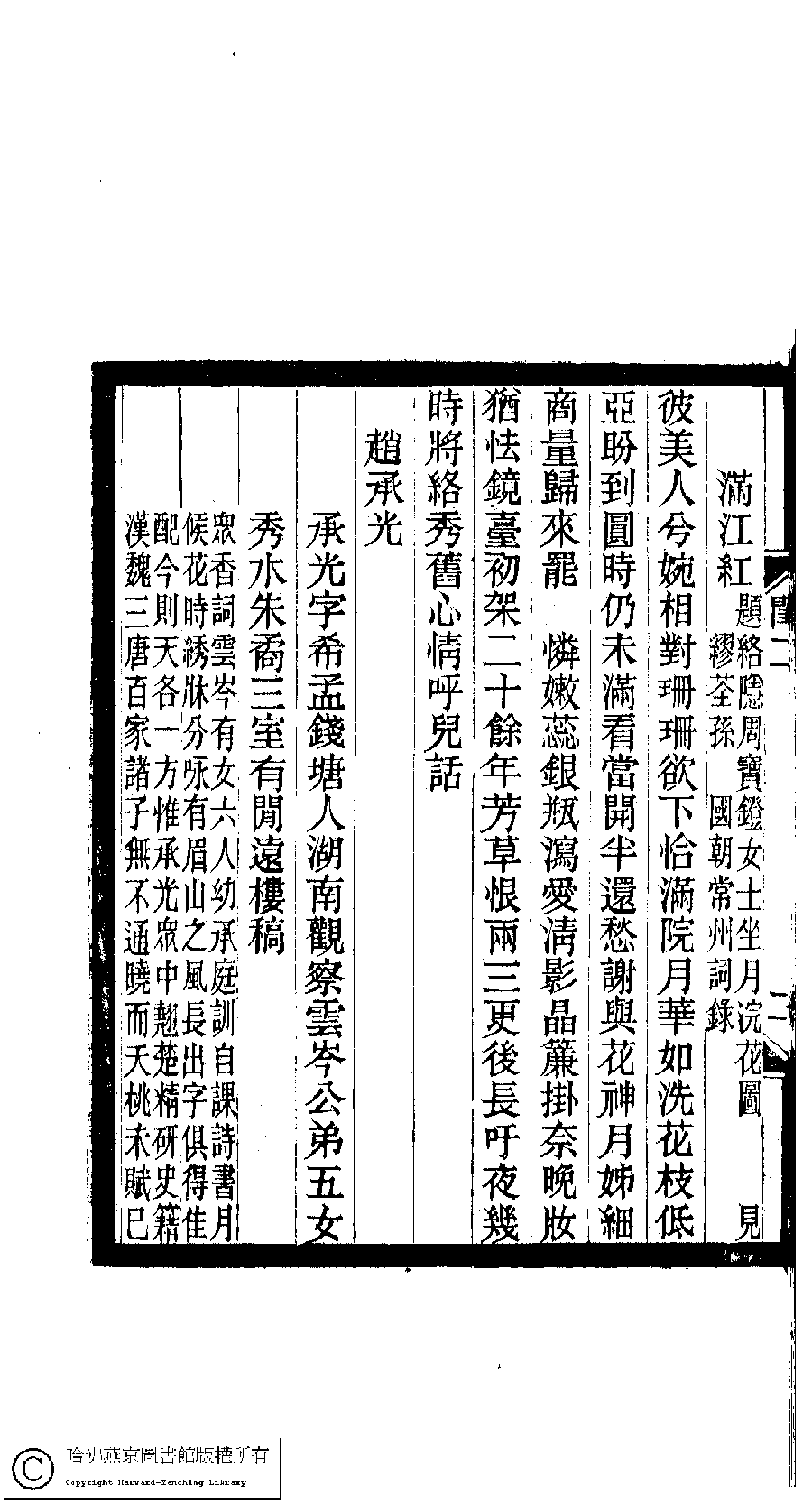 | (PRINT FRIENDLY VERSION) 閨秀詞鈔﹕十六卷(清徐乃昌輯)。清宣統元年(1909)小檀欒室刻本。 ![]() Page : 2.3b | click for larger image | 閨秀詞鈔﹕十六卷(清徐乃昌輯)。清宣統元年(1909)小檀欒室刻本。![]() Page : 2.3a | click for larger image | 閨秀詞鈔﹕十六卷(清徐乃昌輯)。清宣統元年(1909)小檀欒室刻本。![]() Page : 2.2b | click for larger image | Back |
