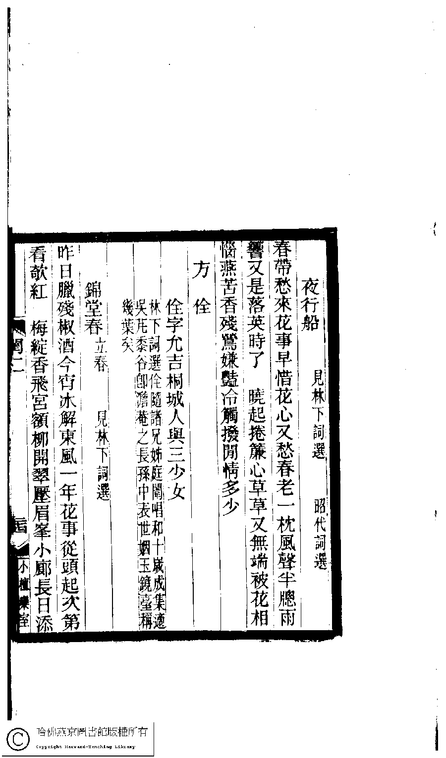 | (PRINT FRIENDLY VERSION) 閨秀詞鈔﹕十六卷(清徐乃昌輯)。清宣統元年(1909)小檀欒室刻本。 ![]() Page : 2.24a | click for larger image | Back |