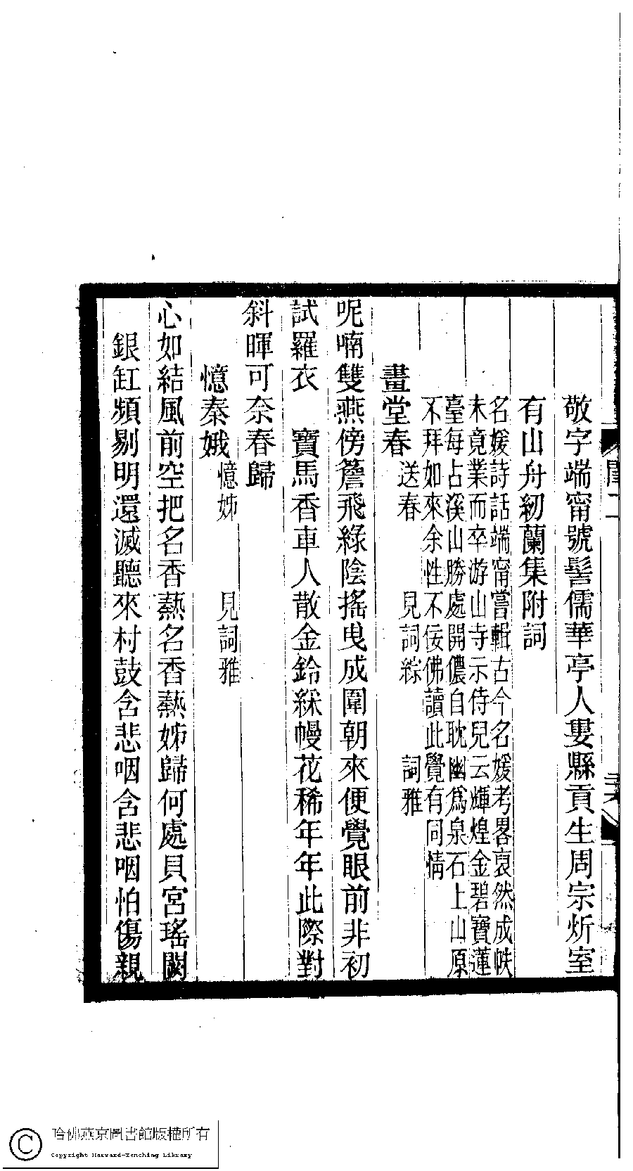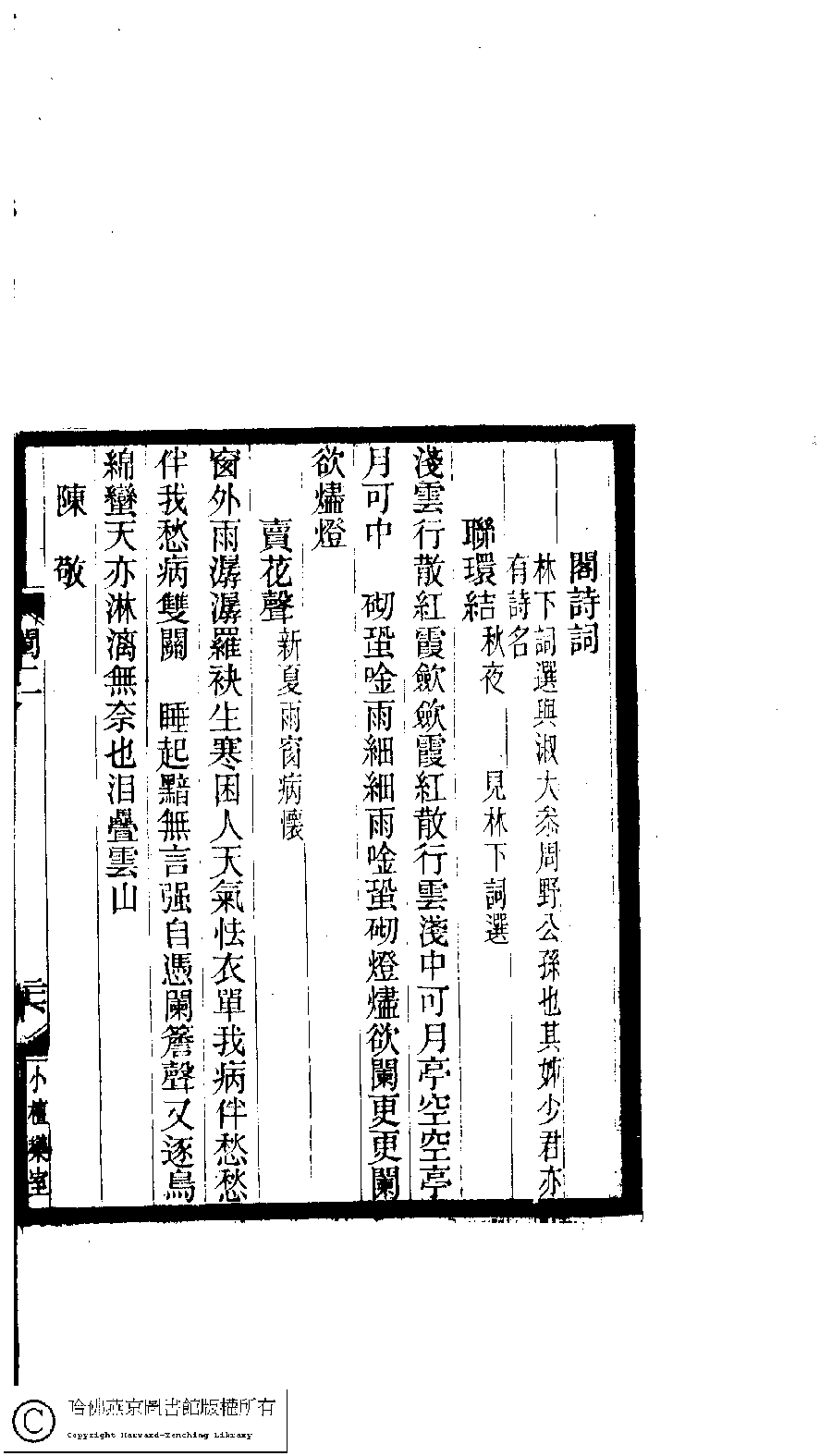 | (PRINT FRIENDLY VERSION) 閨秀詞鈔﹕十六卷(清徐乃昌輯)。清宣統元年(1909)小檀欒室刻本。 ![]() Page : 2.26b | click for larger image | 閨秀詞鈔﹕十六卷(清徐乃昌輯)。清宣統元年(1909)小檀欒室刻本。![]() Page : 2.26a | click for larger image | Back |