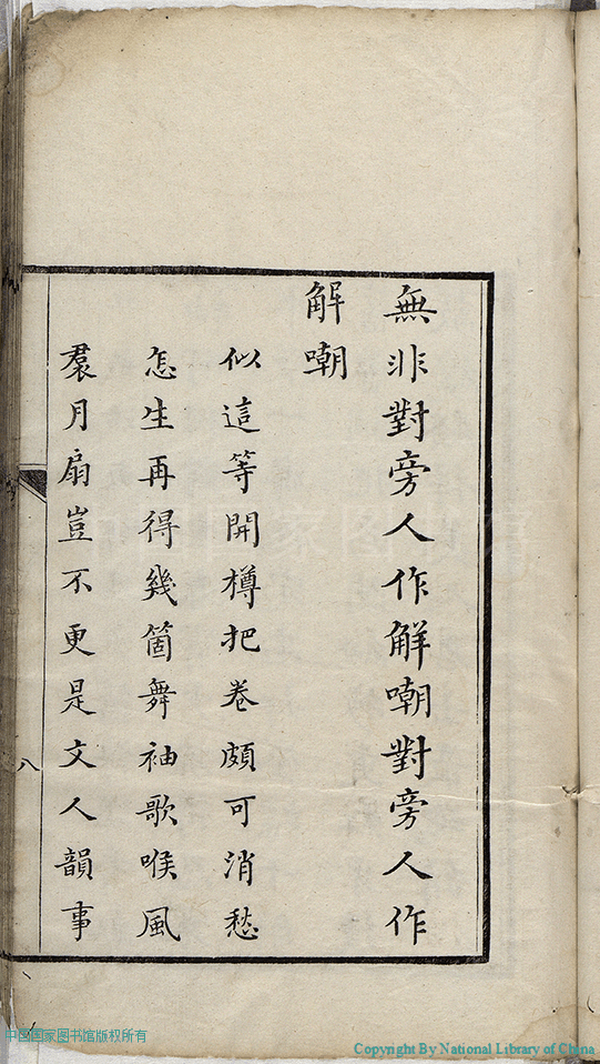 | (PRINT FRIENDLY VERSION) 喬影:一卷(清吳藻撰)。清(1820-1911)刻本 ![]() Page : 喬影.8a | click for larger image | 喬影:一卷(清吳藻撰)。清(1820-1911)刻本![]() Page : 喬影.7b | click for larger image | Back |