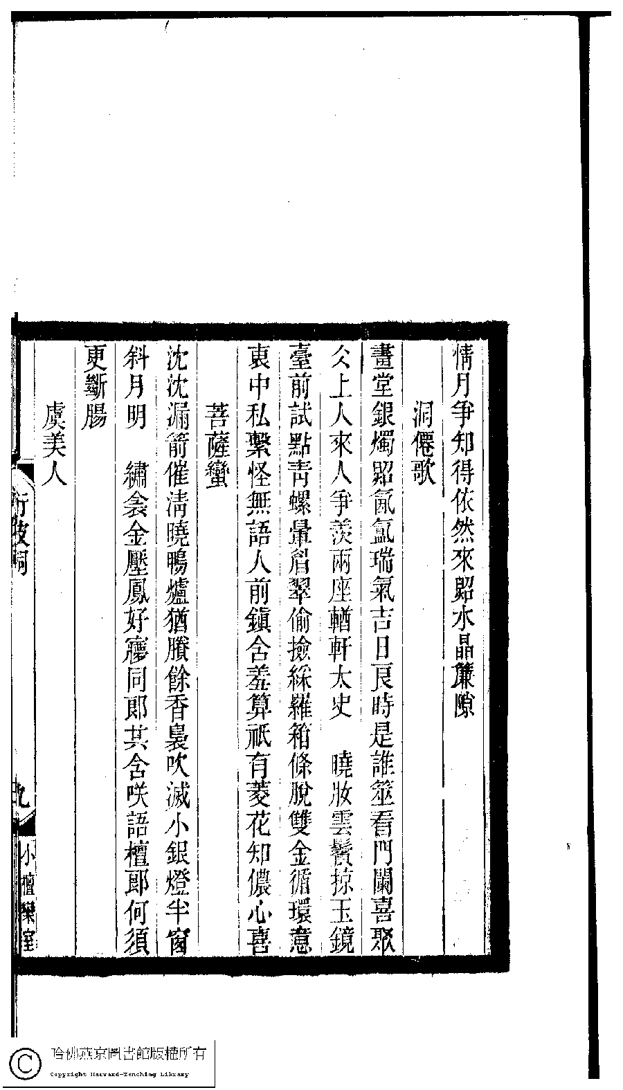 | (PRINT FRIENDLY VERSION) 小檀欒室彙刻閨秀詞﹕十集一百種一百卷(清徐乃昌輯) : 衍波詞﹕一卷。清光緒二十二年(1896)南陵徐氏刻本。 ![]() Page : 衍波詞.9a | click for larger image | Back |